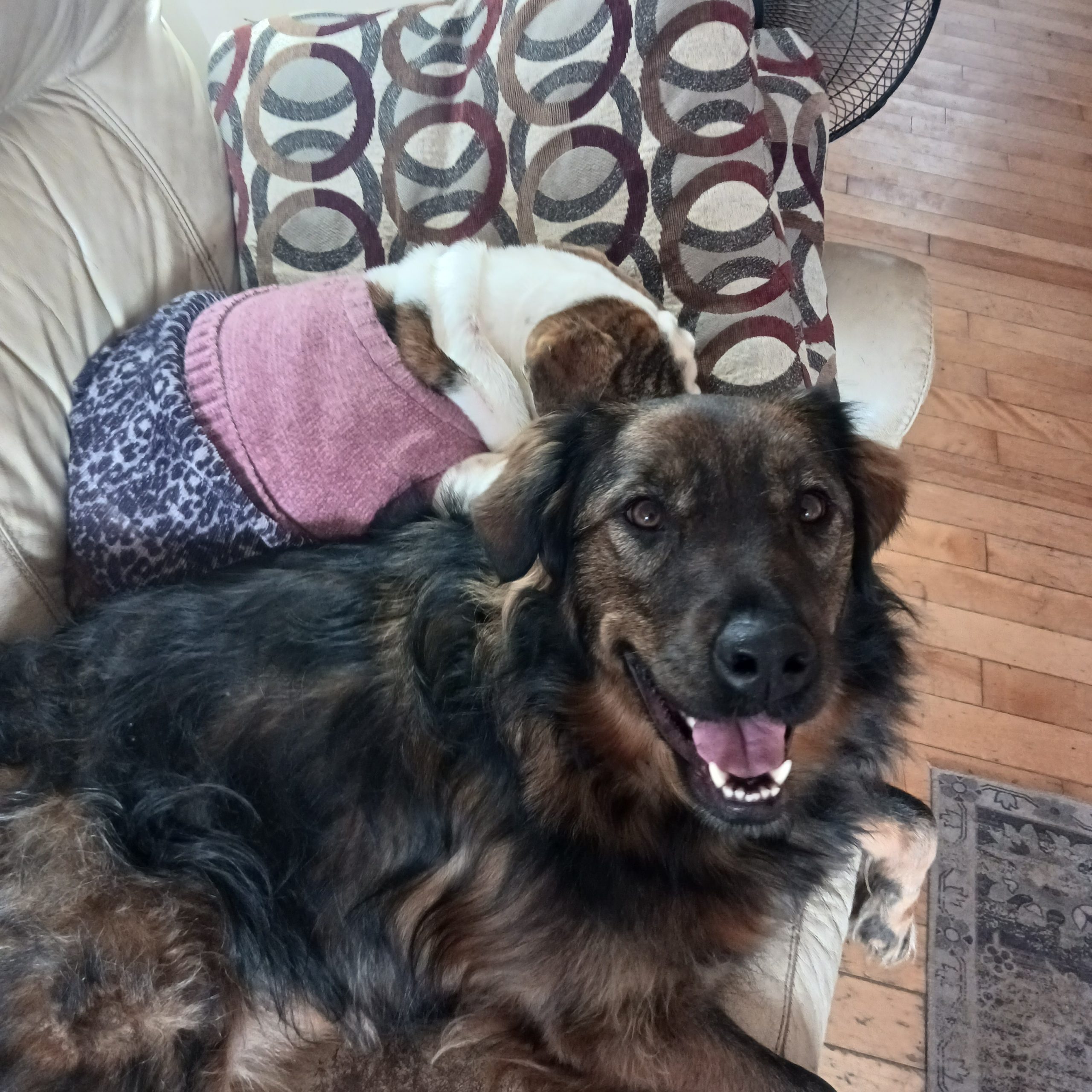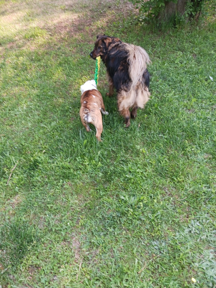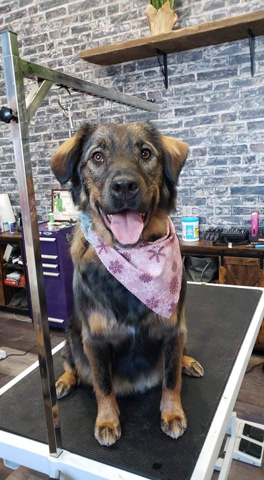 Allie is great around other animals (she has three other dog siblings as well as a cat) and a wagging tail. I have always been a dog owner but never felt "this is a dog that should be shared with the World" until Allie. Allie can be a very high energy dog or one massive cuddle. Gorgeous, double coated, and a big hair Ball. Very comfortable in public, calm around other people, dogs, and with noise. Allie is a very strong dog but has great awareness of this. Need a sled ride, Allie has your back.