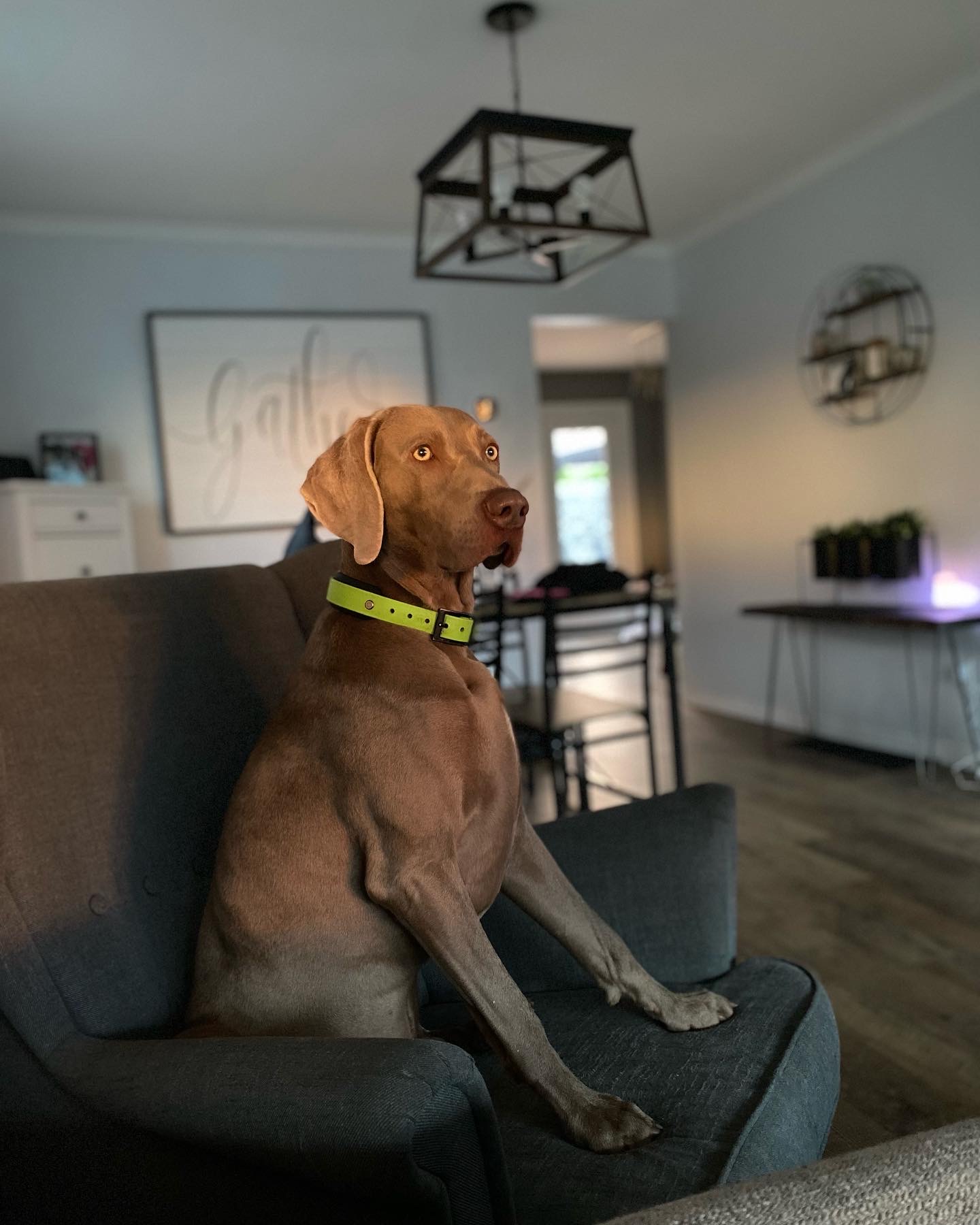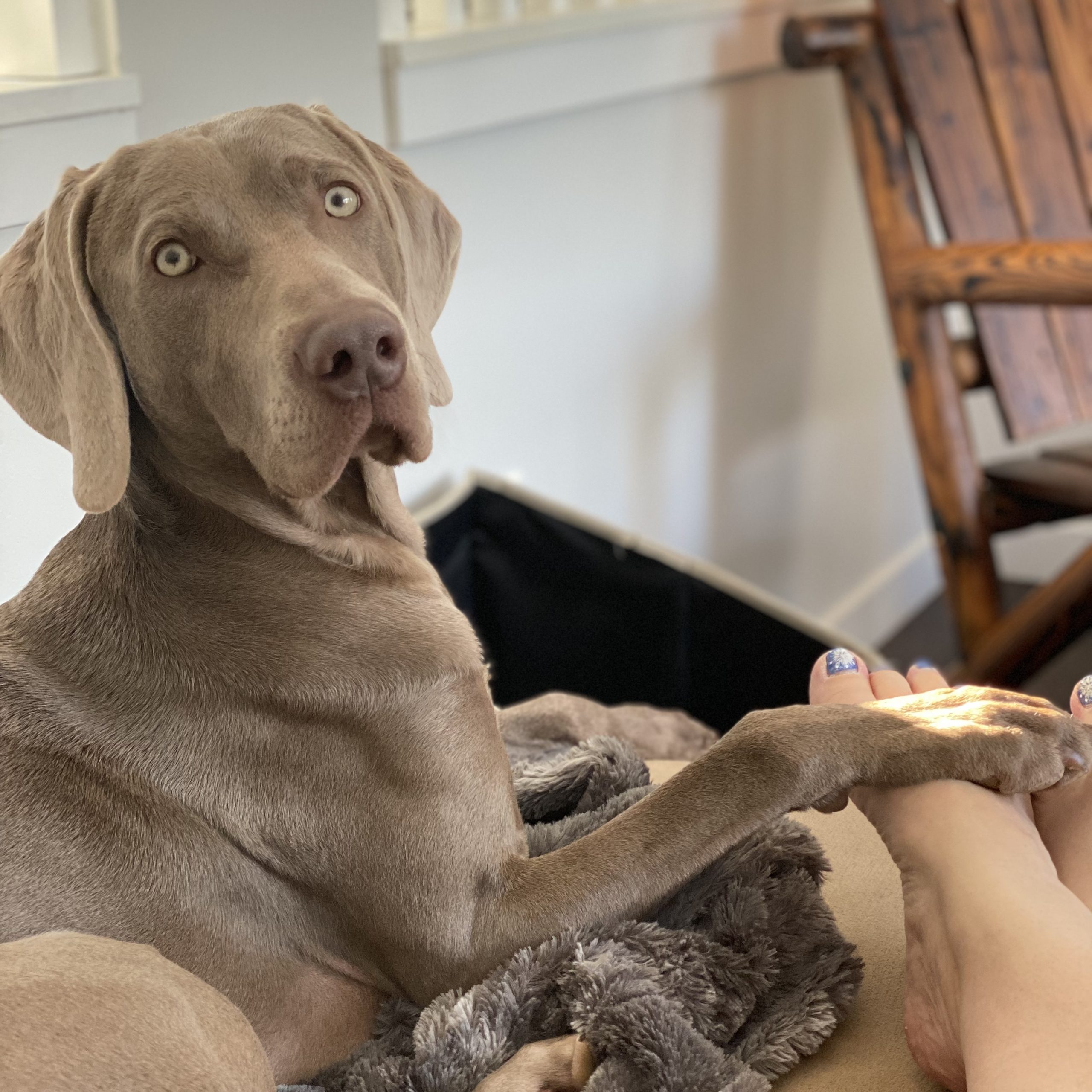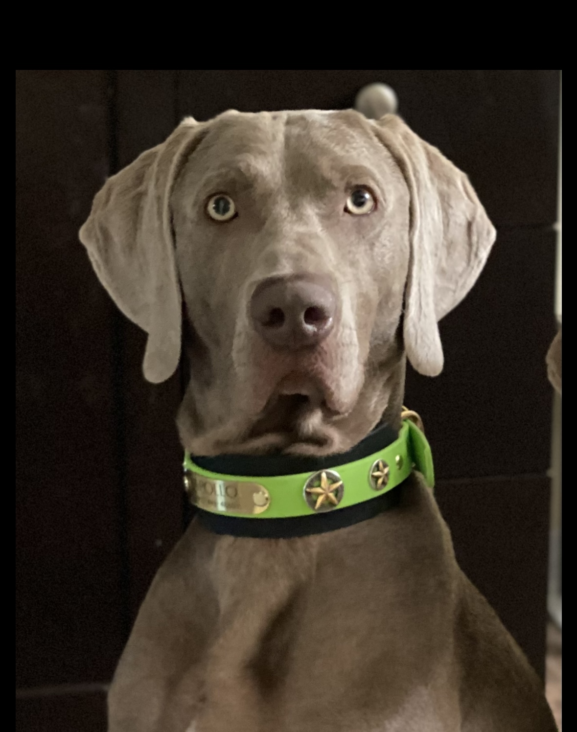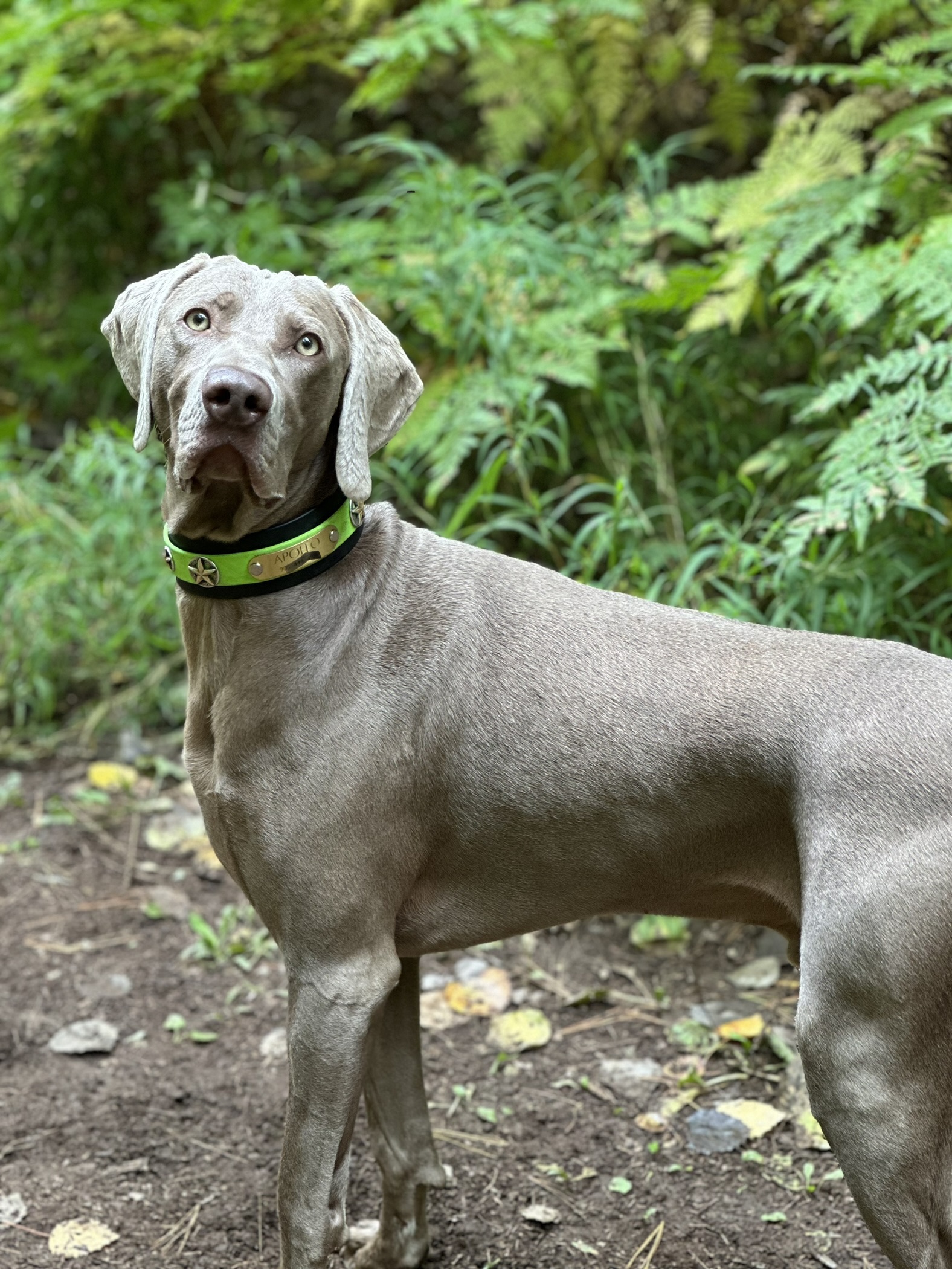 Apollo will be 4 years in December and is a silver Weimaraner. He is the most attentive dog I have even owned . He is capable of learning anything in minutes.