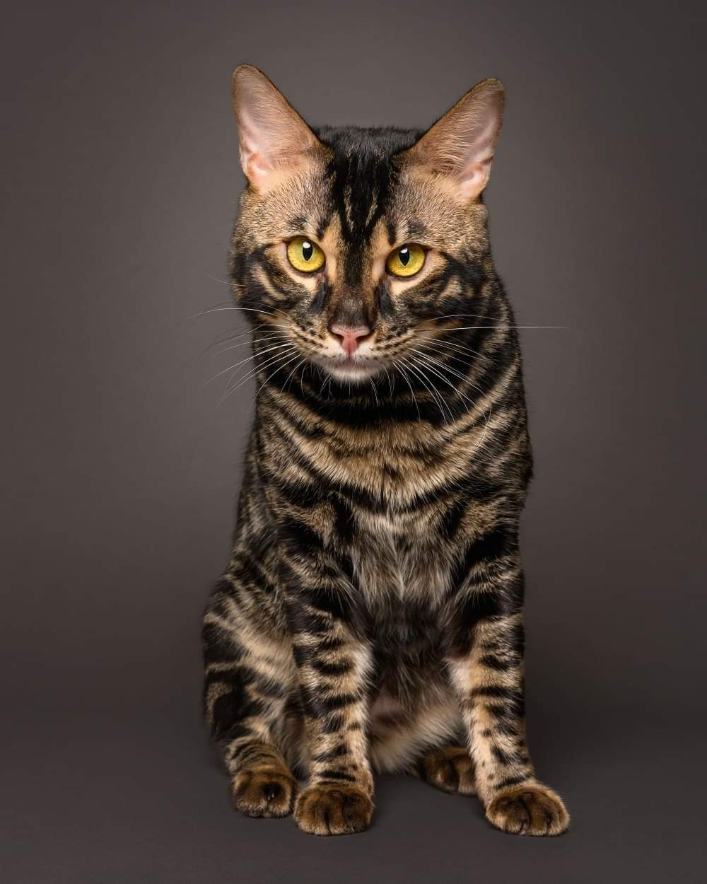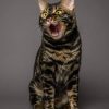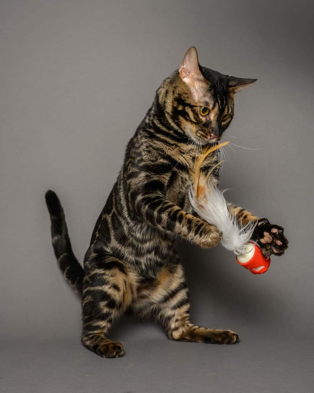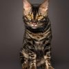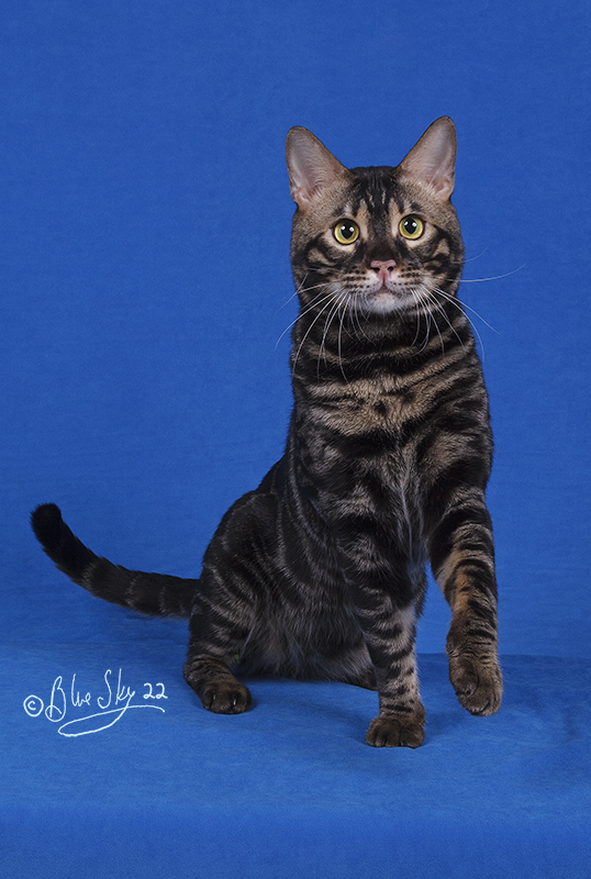 Bagheera is currently a year and a half old. He is a brown charcoal spotted Bengal and is currently sitting at best charcoal for our region through TICA. From his large, muscular build, to his sweet, gentle personality, he is a dream come true. Competing in cat shows since only 4 months old, he has alot of experience with getting used to new people and being positioned/placed in a certain way. He absolutely loves to play with his toys (wands are his favorite) and snuggle up with his family members when the time comes. He does well with other cats and dogs and does not growl, hiss or bite. He does so well at the cat shows, he loves being the centre of attention and having all eyes on him. He is a true comedian and we are so lucky to have him in our lives. Being a brown charcoal Bengal, he almost looks as if he is black but you can still see those stunning markings on a dark background. Very strong with a large build, he is the perfect representation of the Bengal breed. Although he is generally a calm boy, as soon as he sees his favorite toys, it's a complete other story! He is still the sweetest boy but his energy levels are just out of this world! Would do well with other cats, dogs, small animals or humans, he's easy to please.