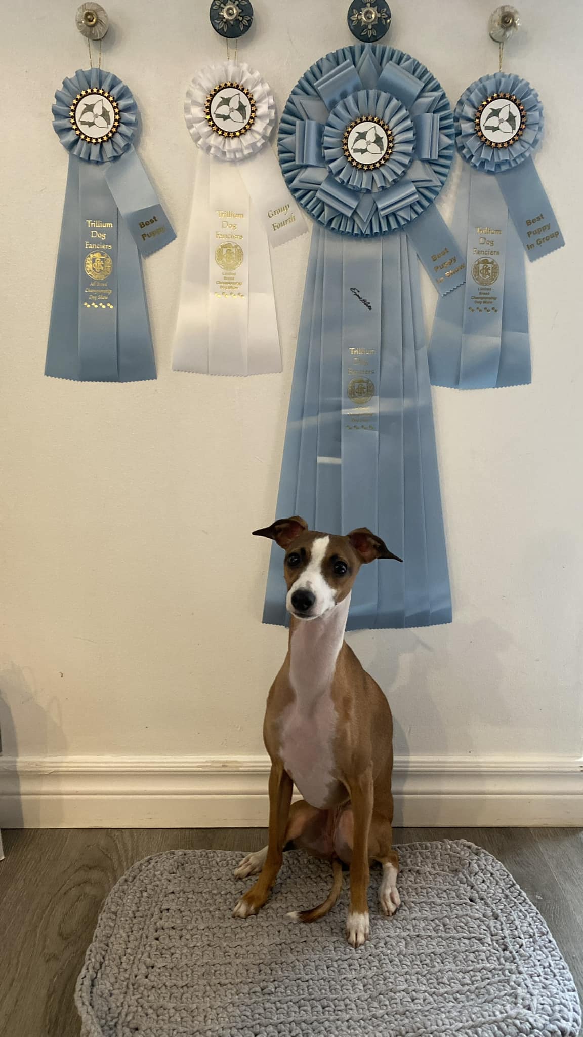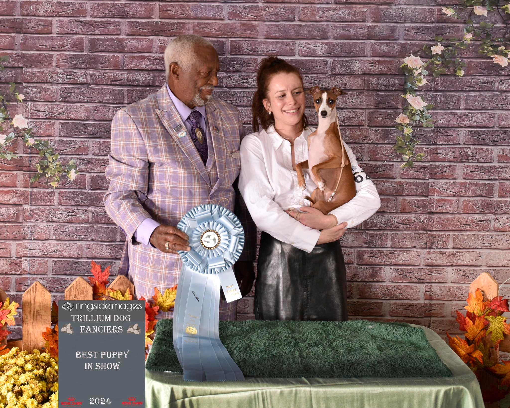 Meet Bunny! A Champion Show Dog with a big personality. She’s silly, confident, and full of energy. Raised with Toy Poodles, Bunny isn’t your typical Italian Greyhound—she’s playful, toy-obsessed, and loves making new friends, both human and furry. Whether she's showing off her goofy side or strutting her stuff, Bunny brings joy wherever she goes.