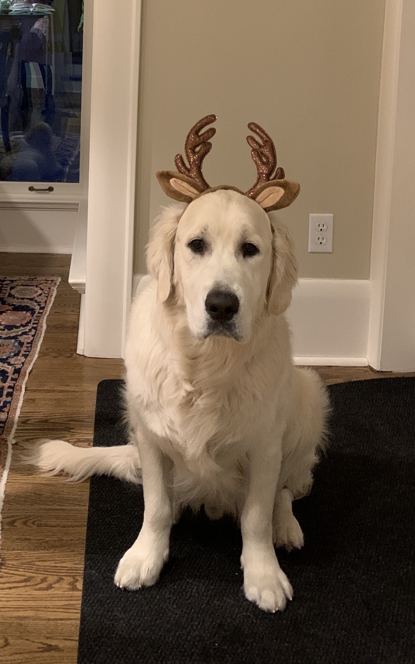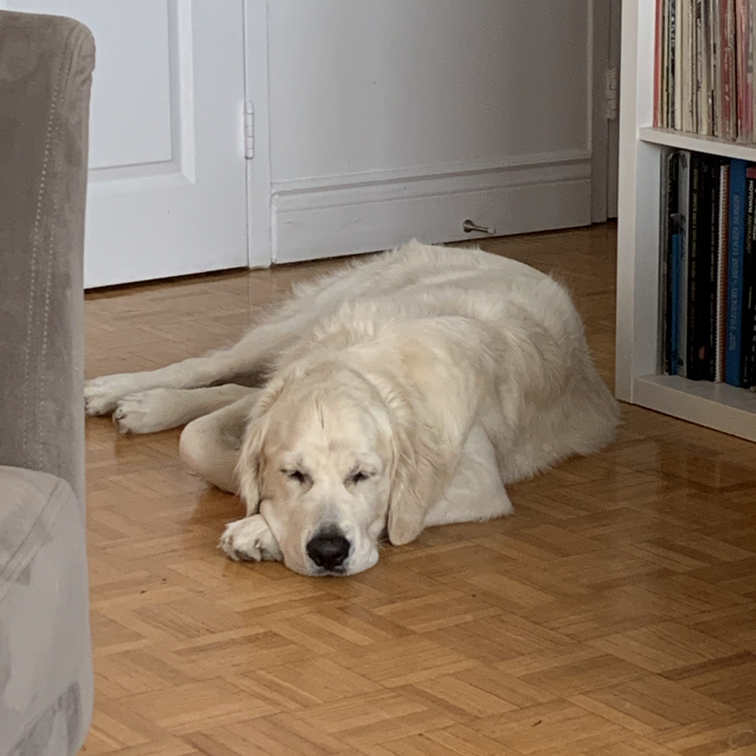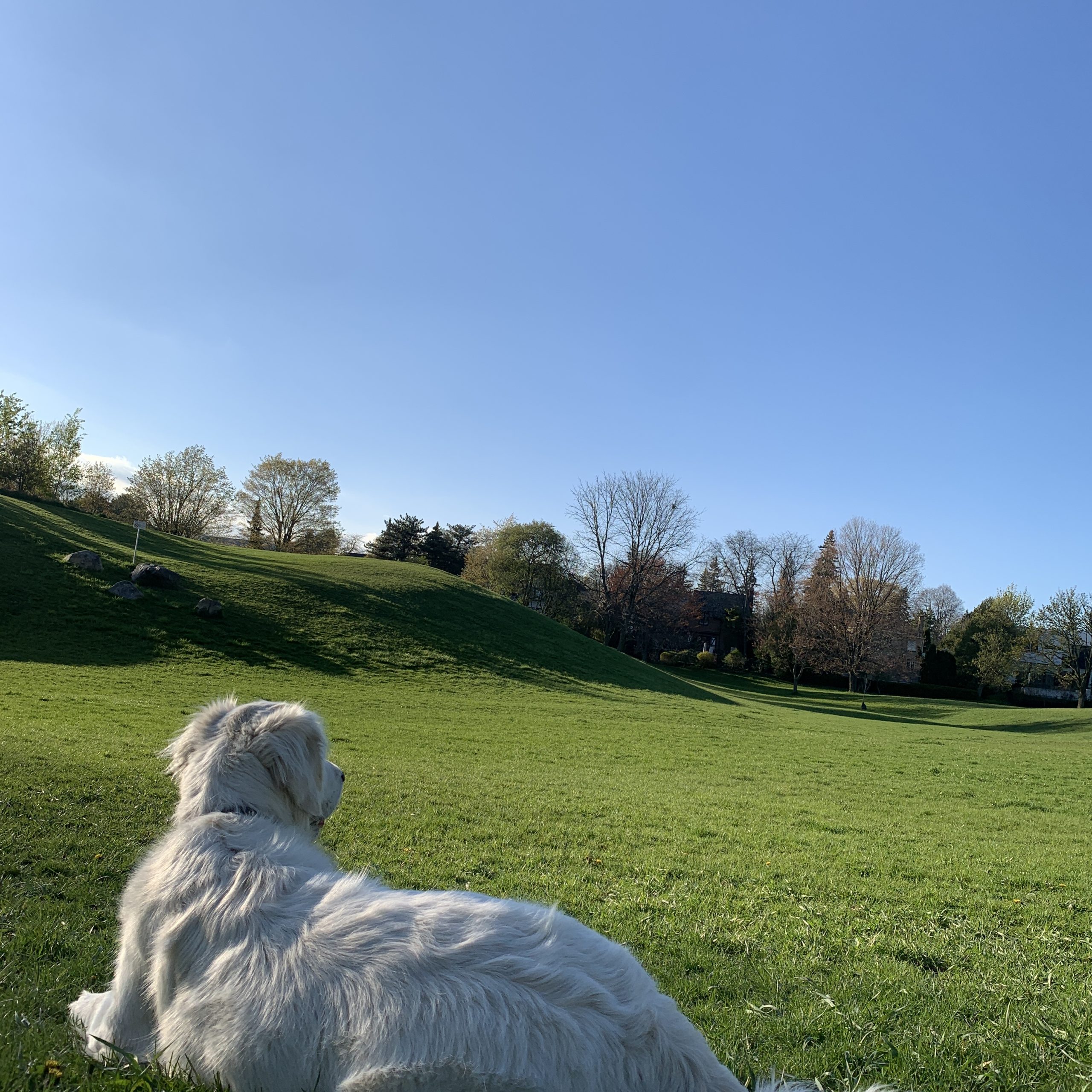 Casper is truly a friendly ghost! Named as the "most handsome" dog in the neighborhood, he's a fully-white golden retriever who is everyone's friend (and we mean that literally - one day he accidentally got picked up by the wrong person from daycare, but the staff didn't think much of it because he was so excited to leave with them!). He sits, down, paw, stand, look, bark, and even flops on command. His signature move is the "crawl" - he will lie on the ground and crawl his way to a dog to say hello! His bark command is an interesting one - there is the quiet bark which we call the "whrumph" and the big bark "WAH!". Casper absolutely loves water, people, dogs, squirrels, lying on the grass on a sunny day, and finally, all sorts of treats (fruit, peanut butter, yoghurt, ice cubes, you name it!). If we were to pick his best pose, it would be his chin resting on the couch armrest with his innocent eyes looking up. The runner-up would definitely be his "don't wake me up" pose, where he lies down with his paws framing his face and eyes screwed shut! He's a gentle giant! He's an extremely calm boy in the car - you will find him either with his head out the window or peacefully sleeping in the back seat. Casper's a city dog, so he's not afraid of walking past garbage trucks, over grates, passing a busy street and jumping into an SUV. He's very quick to learn so if there's anything else, he'll easily catch on!