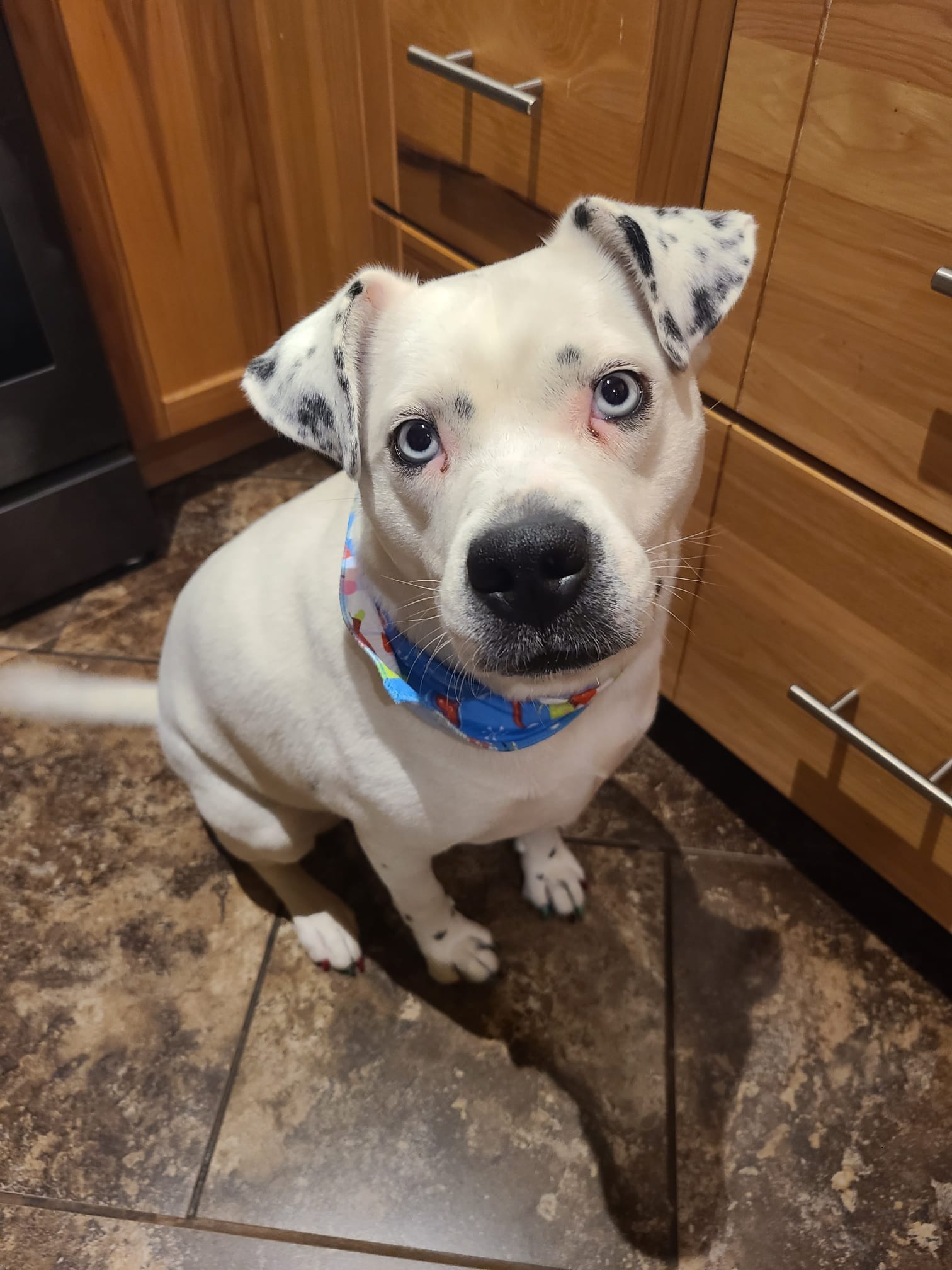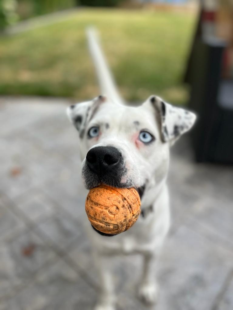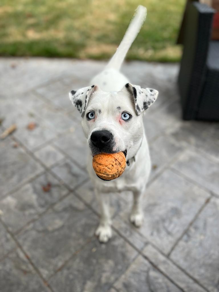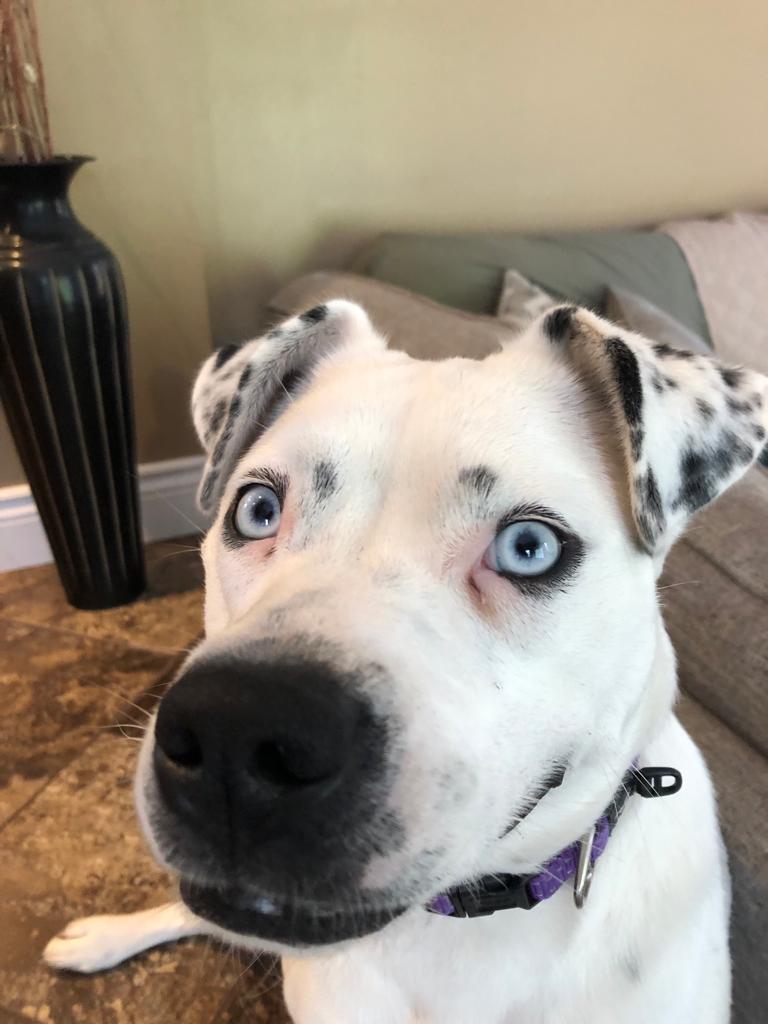 Charlie is the cutest, most goofy dog you'll ever meet. I rescued her from Texas in Sept of 2021, and she's been such a loyal and loving little girl. She's mostly white with some black spots, she looks kind of dalmation, but I did a DNA test and there is no dalmation. She's got bright blue eyes and a big smile! Her ears stand up on the regular, and she's very animated. She's like a cartoon dog. She LOVES stealing shoes, just to carry them around. She loves carrying things in her mouth. She LOVES sunbathing, but also loves playing in the snow. She gets the zoomies when she's really happy and throws toys in the air. She can be high energy, but she can also be very calm. She's VERY quiet, she pretty much never barks. She can let out some weird little squeeks as well as her husky scream when nervous (getting her nails clipped sometimes or trying to get blood from her at the vet lol). She's very dramatic. Because she's got the blue eyes, her stares can be quite intense and hilarious. She's unsure about swimming, so far, but enjoys water from the hose. Her tail is almost always wagging and when she's really excited she does the cutest little bum wiggle. She also walks quite prim and proper, you can definitely tell she's a girl with her little strut.