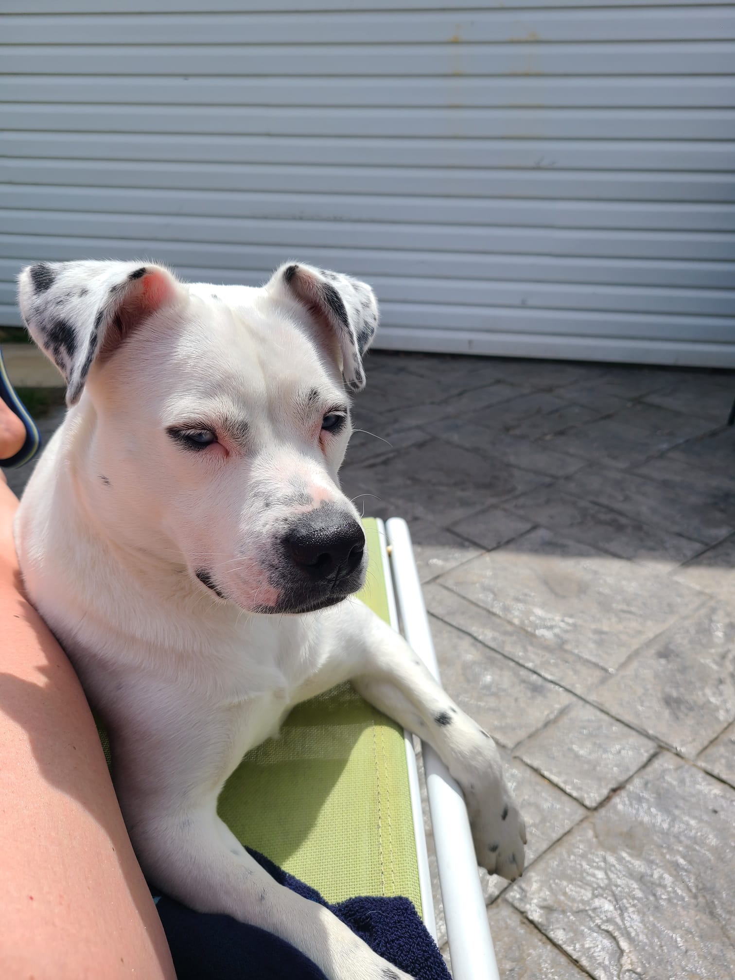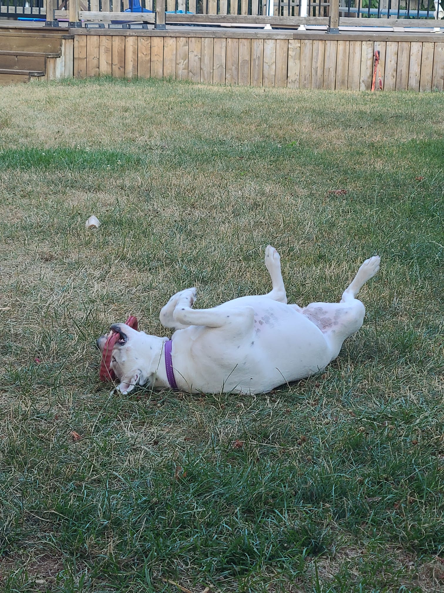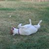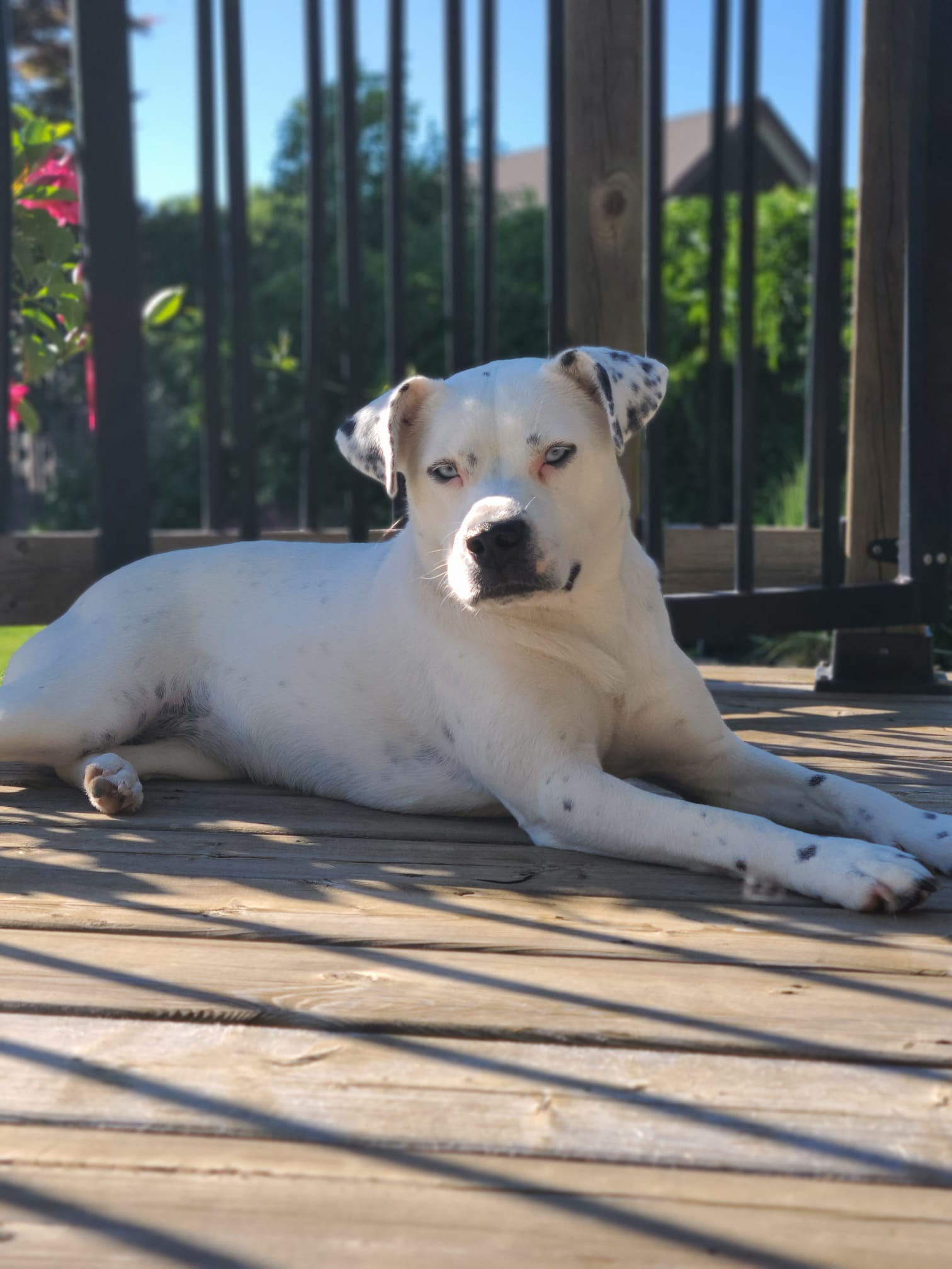 Charlie is the cutest, most goofy dog you'll ever meet. I rescued her from Texas in Sept of 2021, and she's been such a loyal and loving little girl. She's mostly white with some black spots, she looks kind of dalmation, but I did a DNA test and there is no dalmation. She's got bright blue eyes and a big smile! Her ears stand up on the regular, and she's very animated. She's like a cartoon dog. She LOVES stealing shoes, just to carry them around. She loves carrying things in her mouth. She LOVES sunbathing, but also loves playing in the snow. She gets the zoomies when she's really happy and throws toys in the air. She can be high energy, but she can also be very calm. She's VERY quiet, she pretty much never barks. She can let out some weird little squeeks as well as her husky scream when nervous (getting her nails clipped sometimes or trying to get blood from her at the vet lol). She's very dramatic. Because she's got the blue eyes, her stares can be quite intense and hilarious. She's unsure about swimming, so far, but enjoys water from the hose. Her tail is almost always wagging and when she's really excited she does the cutest little bum wiggle. She also walks quite prim and proper, you can definitely tell she's a girl with her little strut.