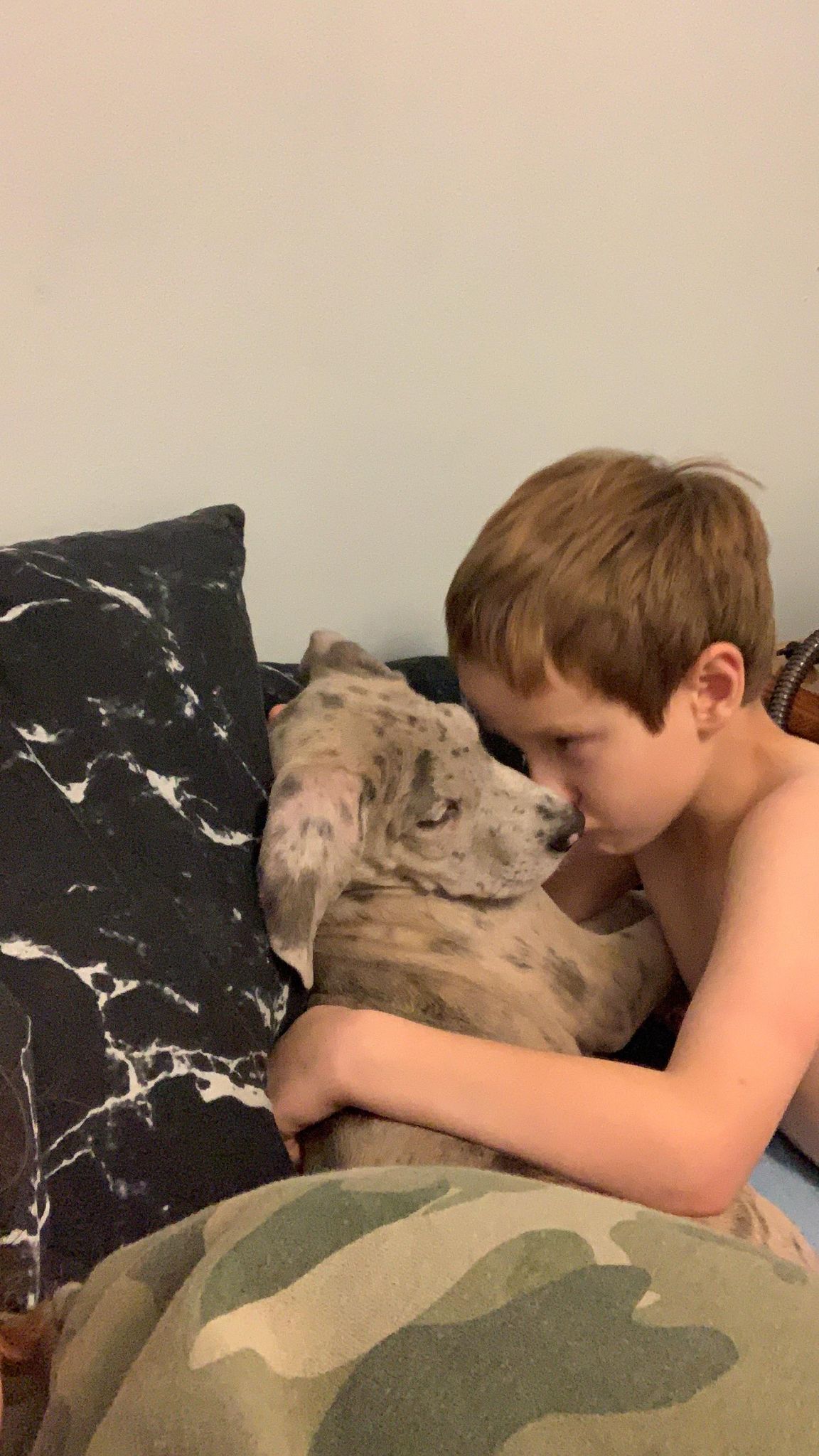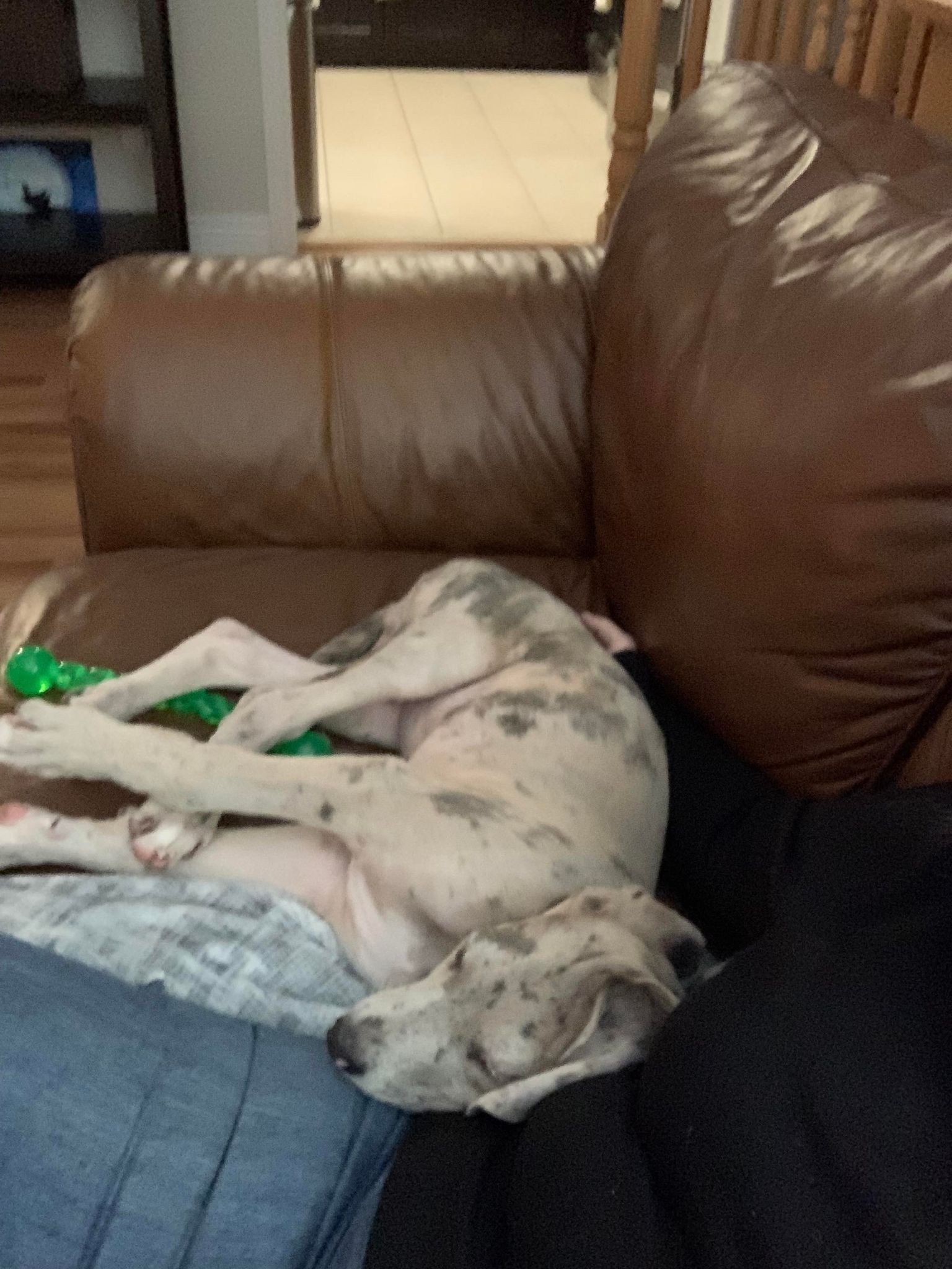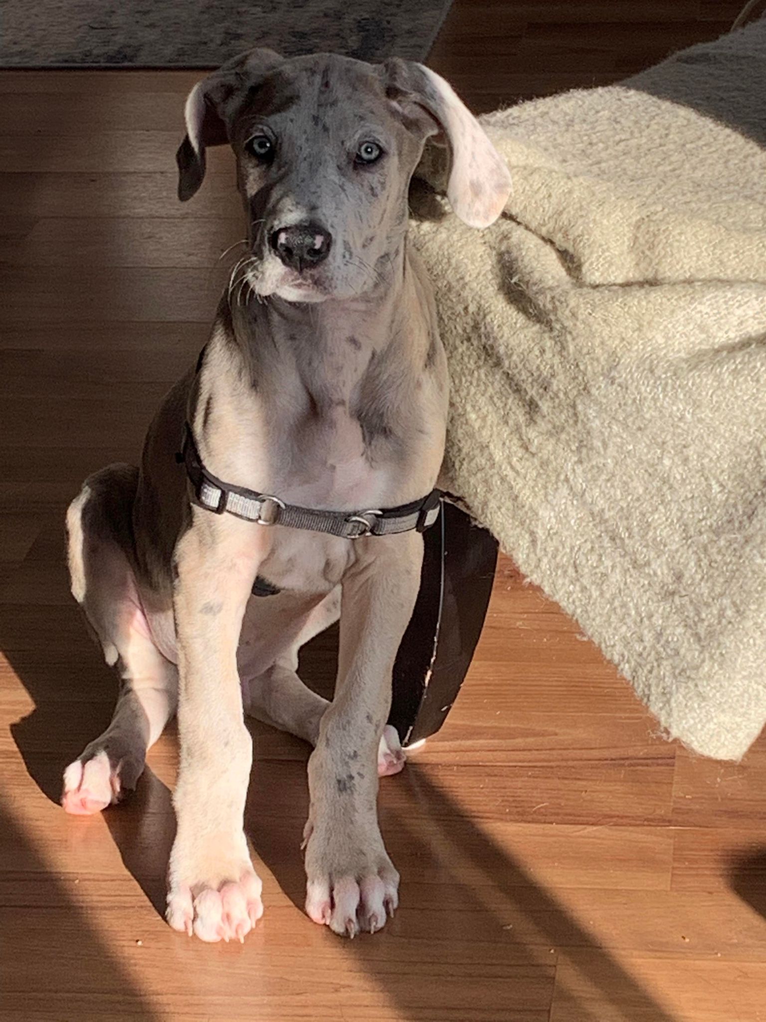 Doback is a three-month-old Dane with an unusual coat: He's a light blue orange brindle merle, so he has the light blue coat, but with light orange striping. He's affectionate and generally calm (he's a puppy, so he's still inclined to occasional active streaks), loves playing with anyone who is willing and he's known to prance to show off his toys when he's particularly proud of them.