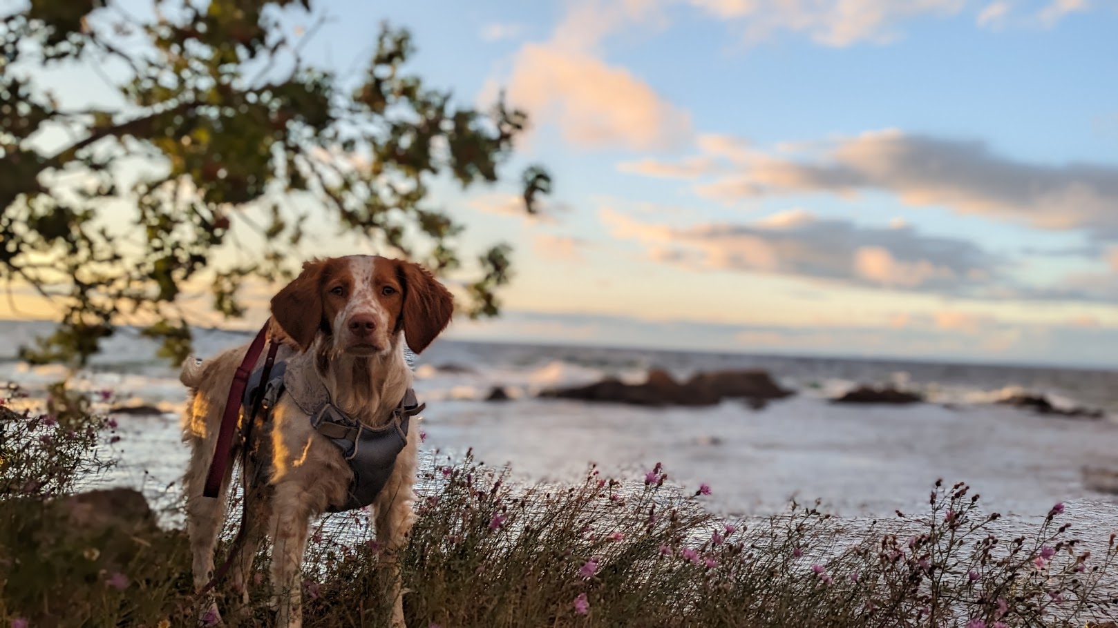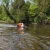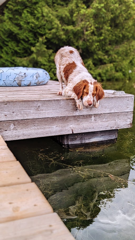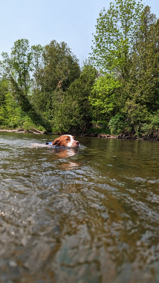 She is both dog and people friendly. I haven't come across anyone she doesn't like. Ducky loves the outdoors and enjoys her fresh air by chasing squirrels, swimming, hiking/running, camping - anything you name, she's game. She especially loves to swim and will often need a reminder to take a break. Once at a cottage, she swam for more than an hour straight. She'll also swim against the river's current, which I'm surprised doesn't tire her.
