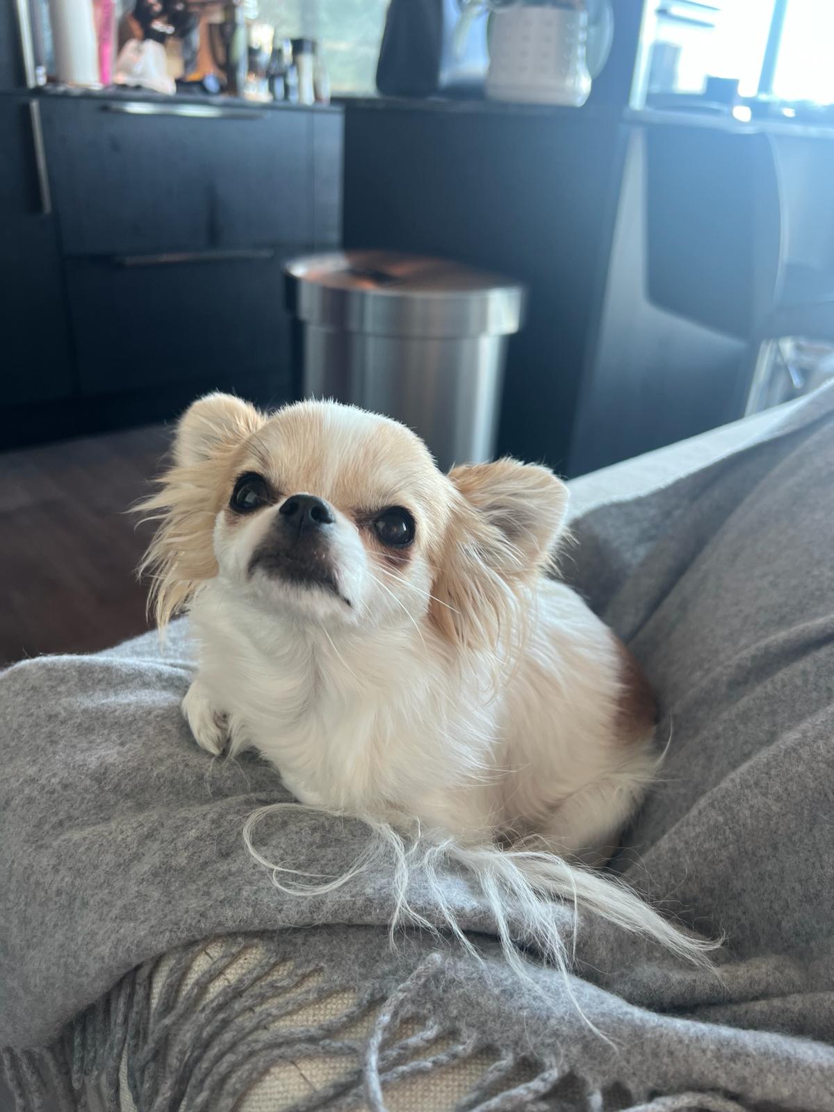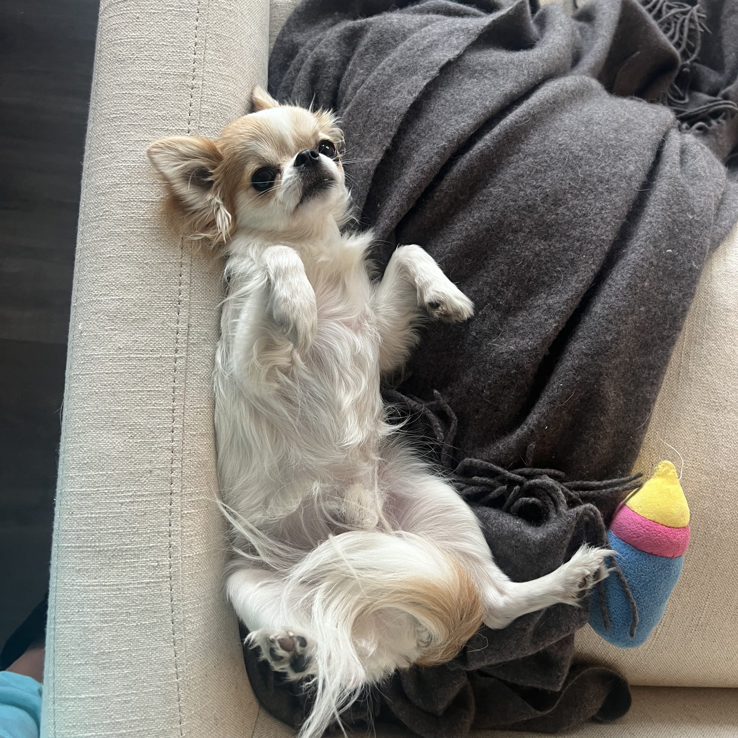 Very relaxed. Cannot bark. Squeaks like a tiny mouse.