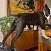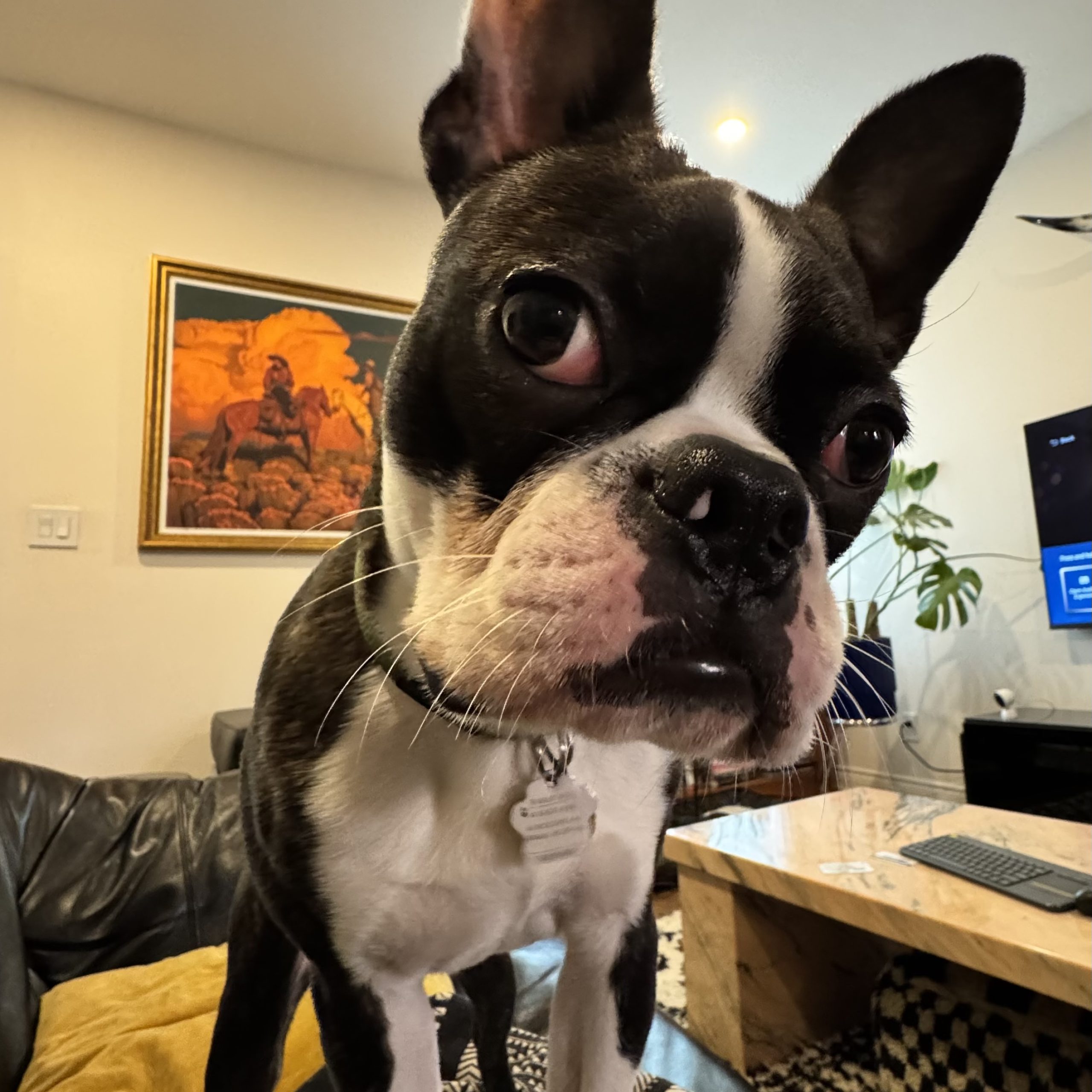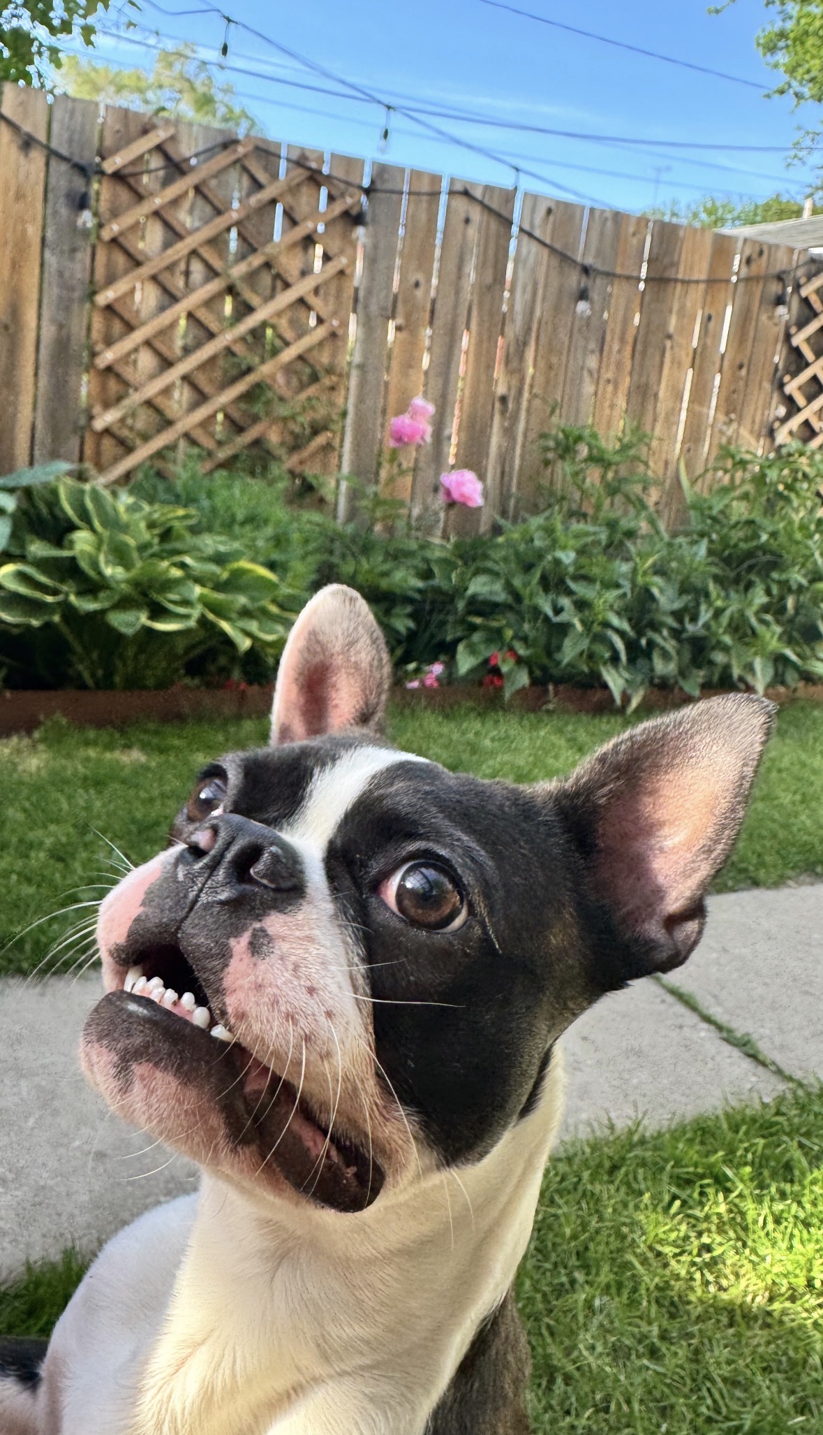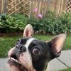 Freddie is a very spunky, smart and affectionate Boston Terrier. He has one of the most perfect Boston terrier patterns I’ve ever seen with a perfectly placed stripe right down the middle of his forehead. His body condition is strong, muscular and lean. He loves to dance on his back legs, hold hands, turn his head side to side, lay on his back exposing his belly, jump high, play frisbee and catch treats and balls out of the air. He is excellent with kids and dogs. A total clown