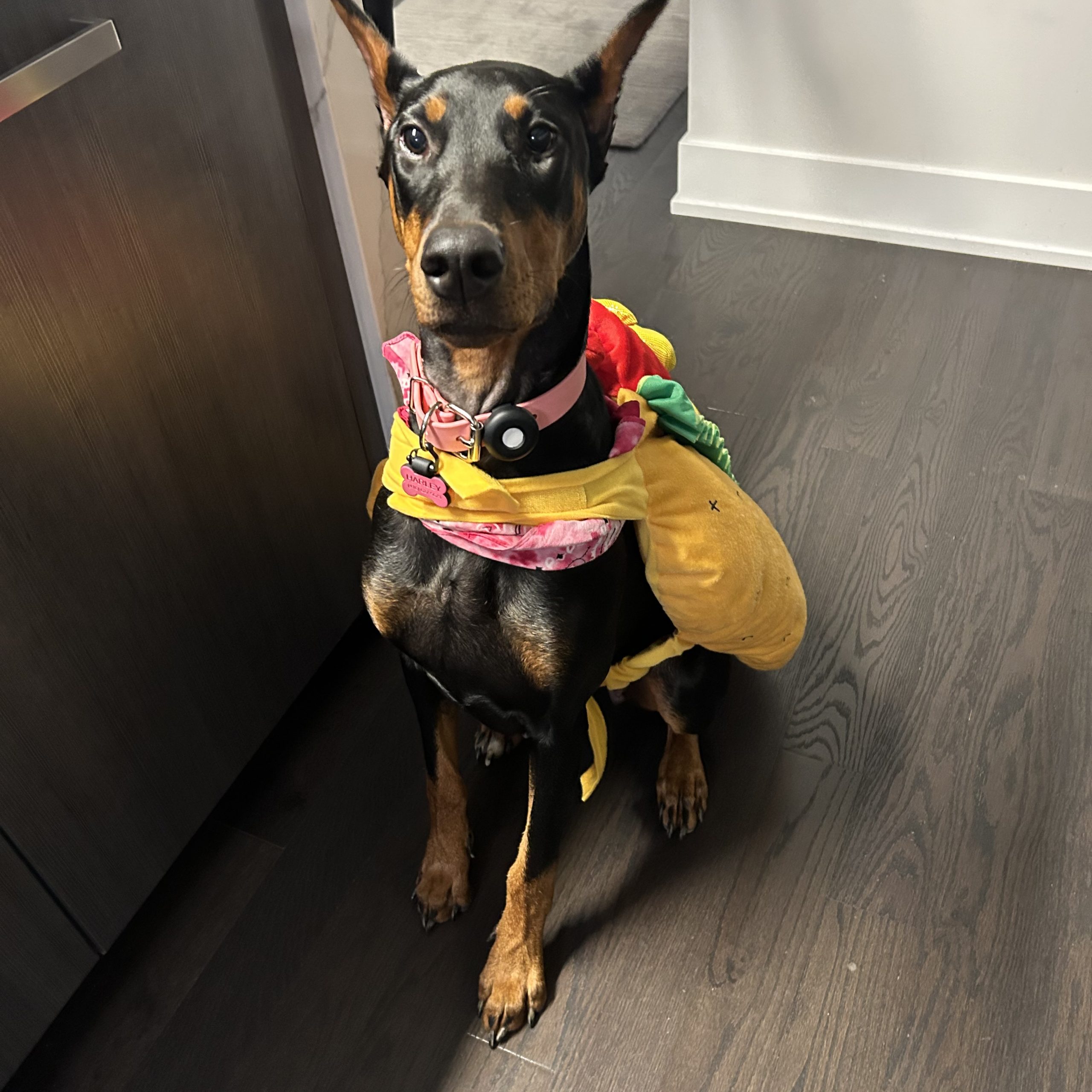 Harley is a 1 year old Female Doberman. Her mother was European, and the father was from Texas. Several dogs from her litter are already showing in competitions. She comes from a very well known breeder. One of her back paws has a white toenail.