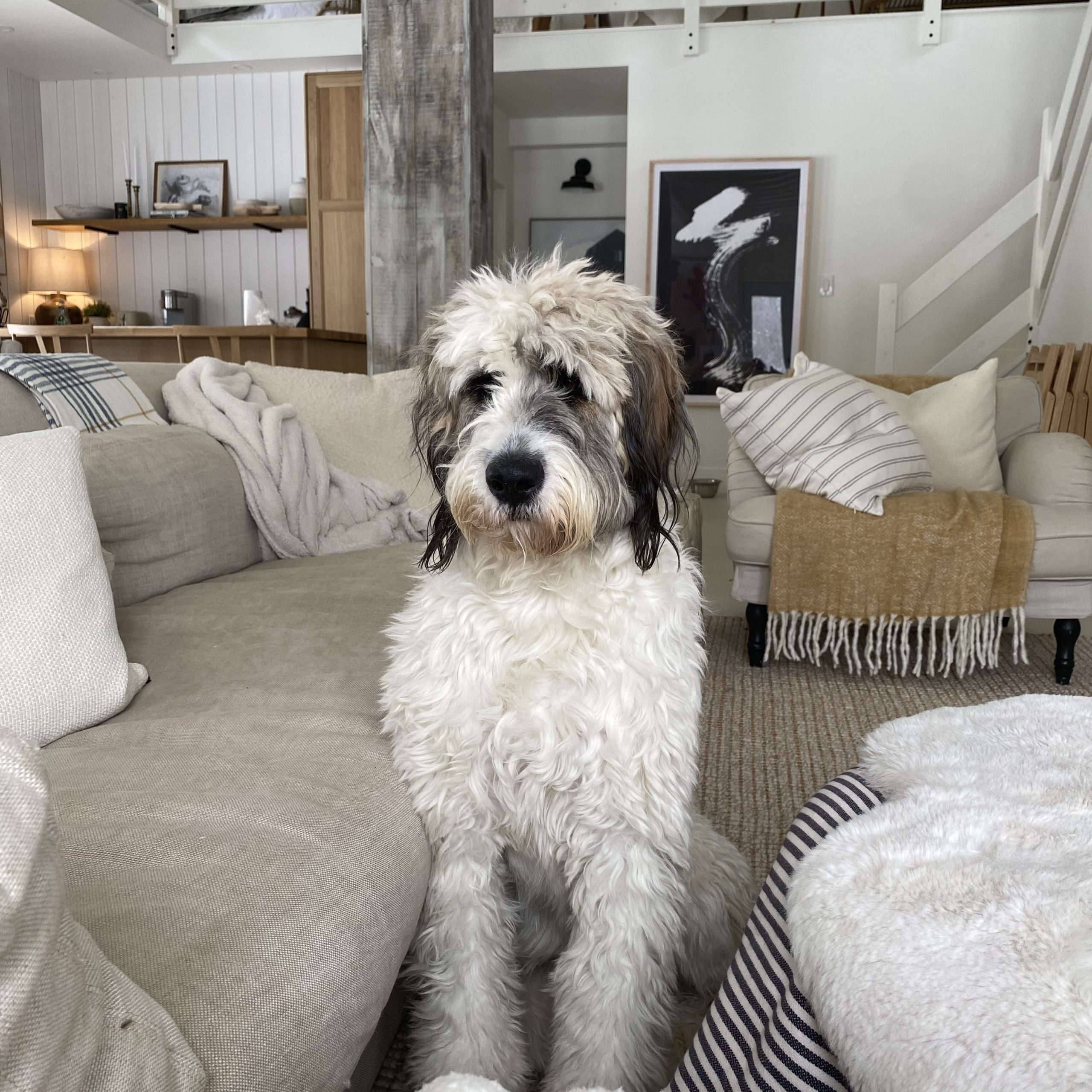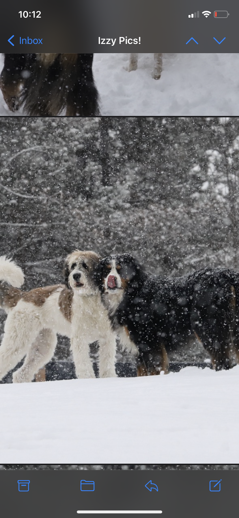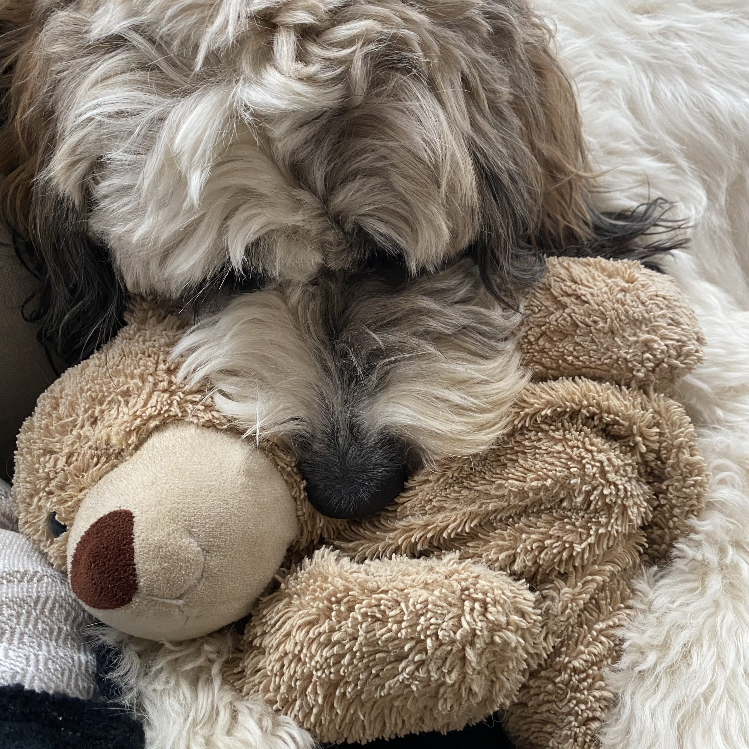 Izzy is a St Bernard/Poodle a designer dog in every sense without the snobbery.  There isn't  a day that goes by that I’m not stopped on the street, she loves up everybody and leaves people smiling. She should be a therapy dog.  She’s amazing with adults and children and gets along with all dogs . She’s still very puppy like, very playful and exuberant .  She loves the outdoors snow and water. She could be an added member to the muppets .