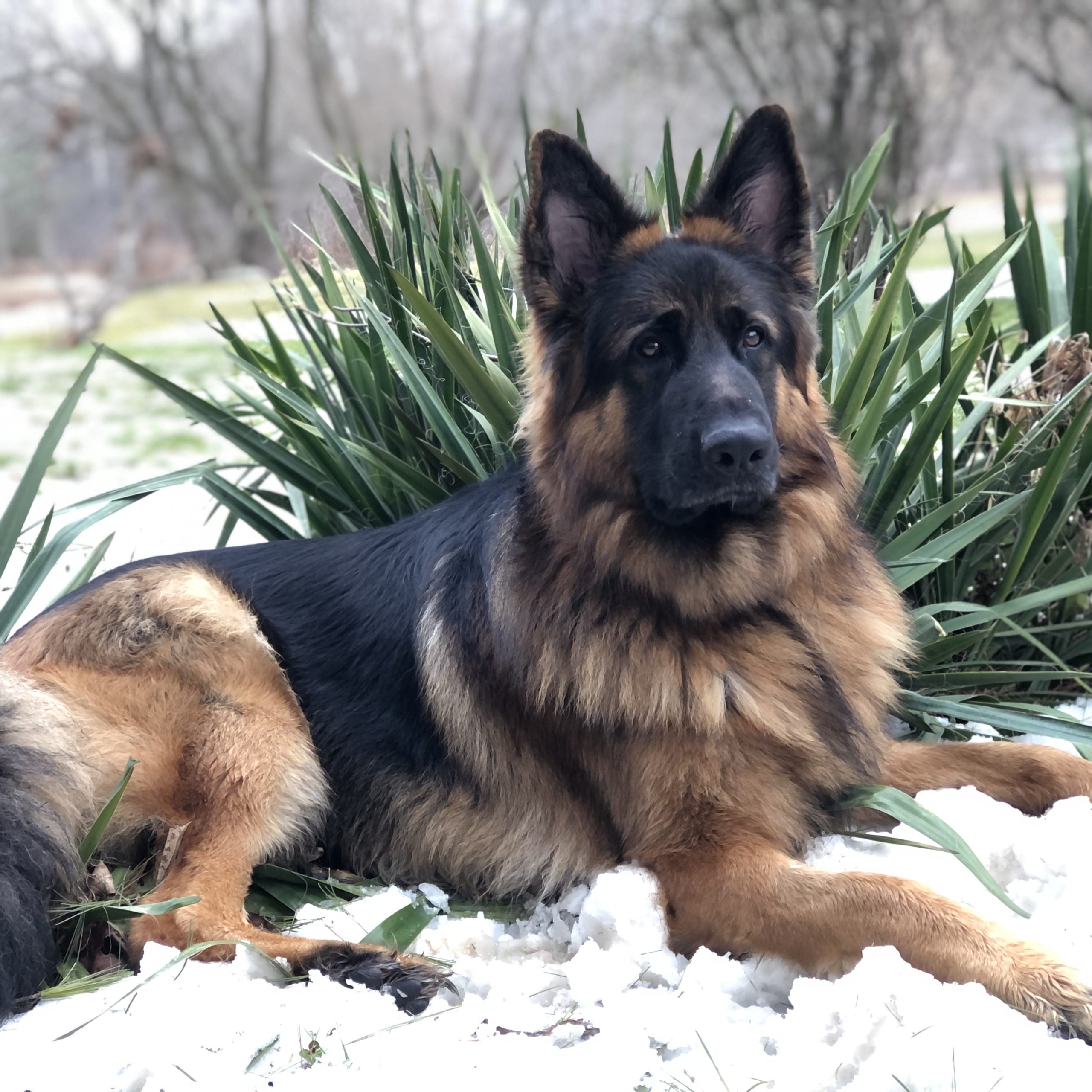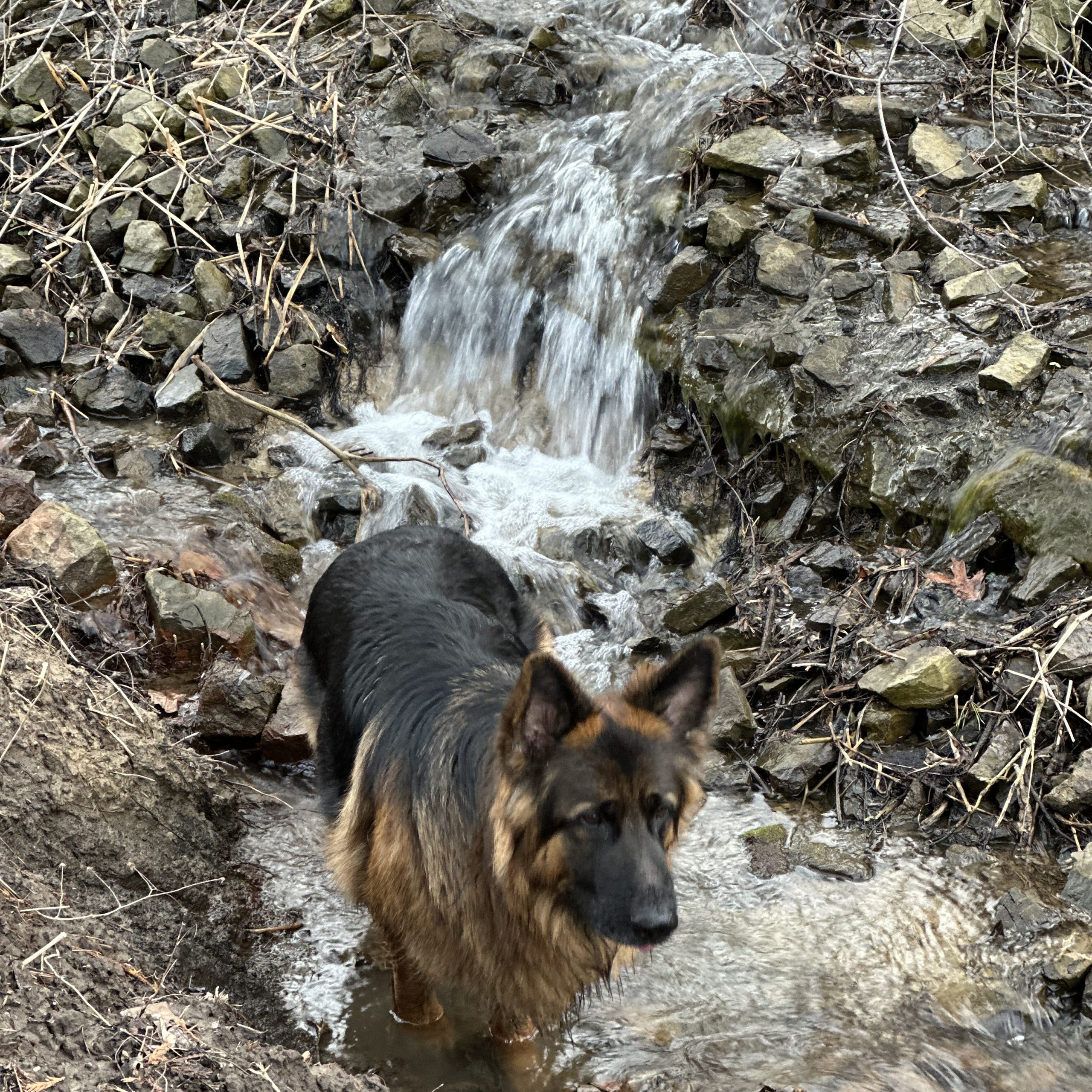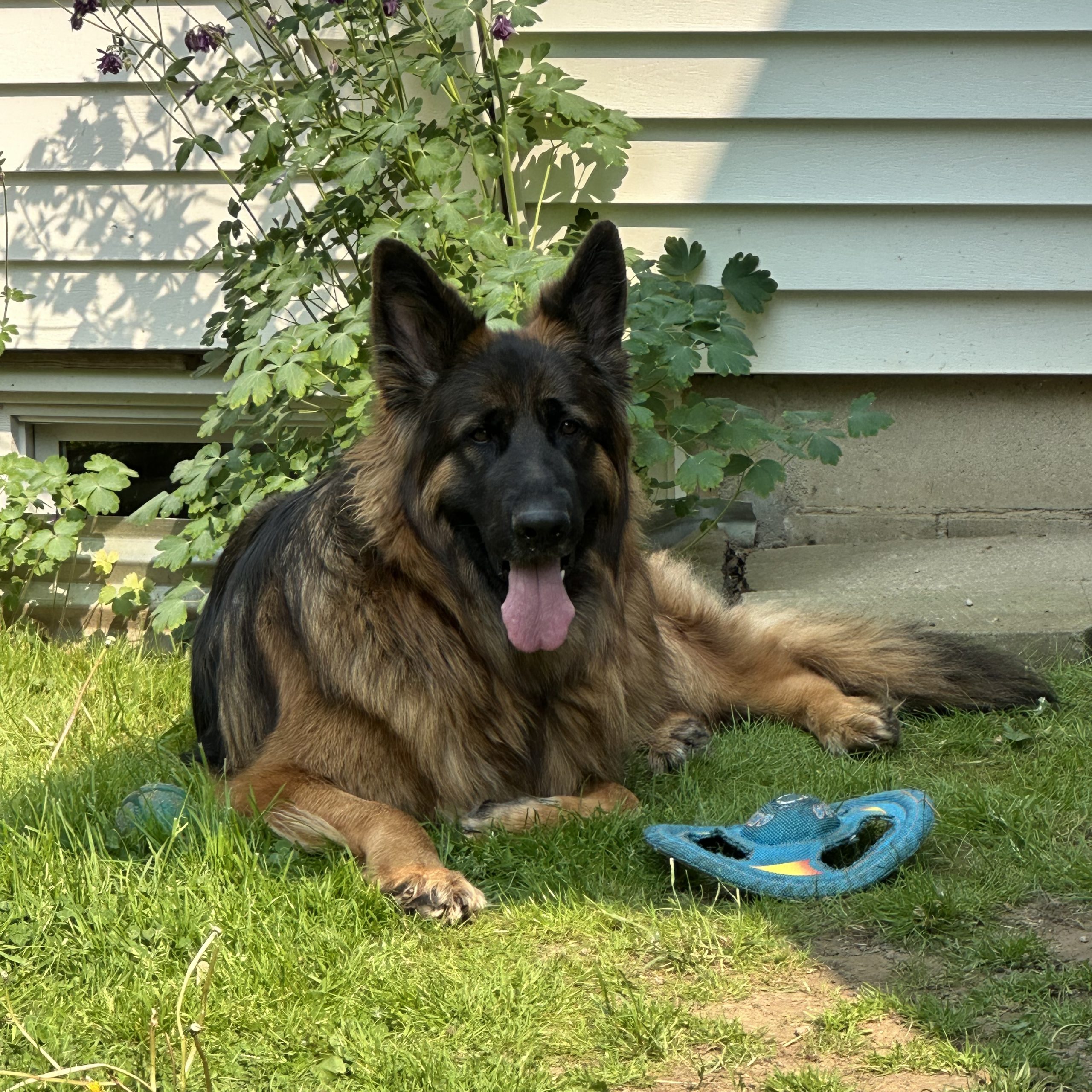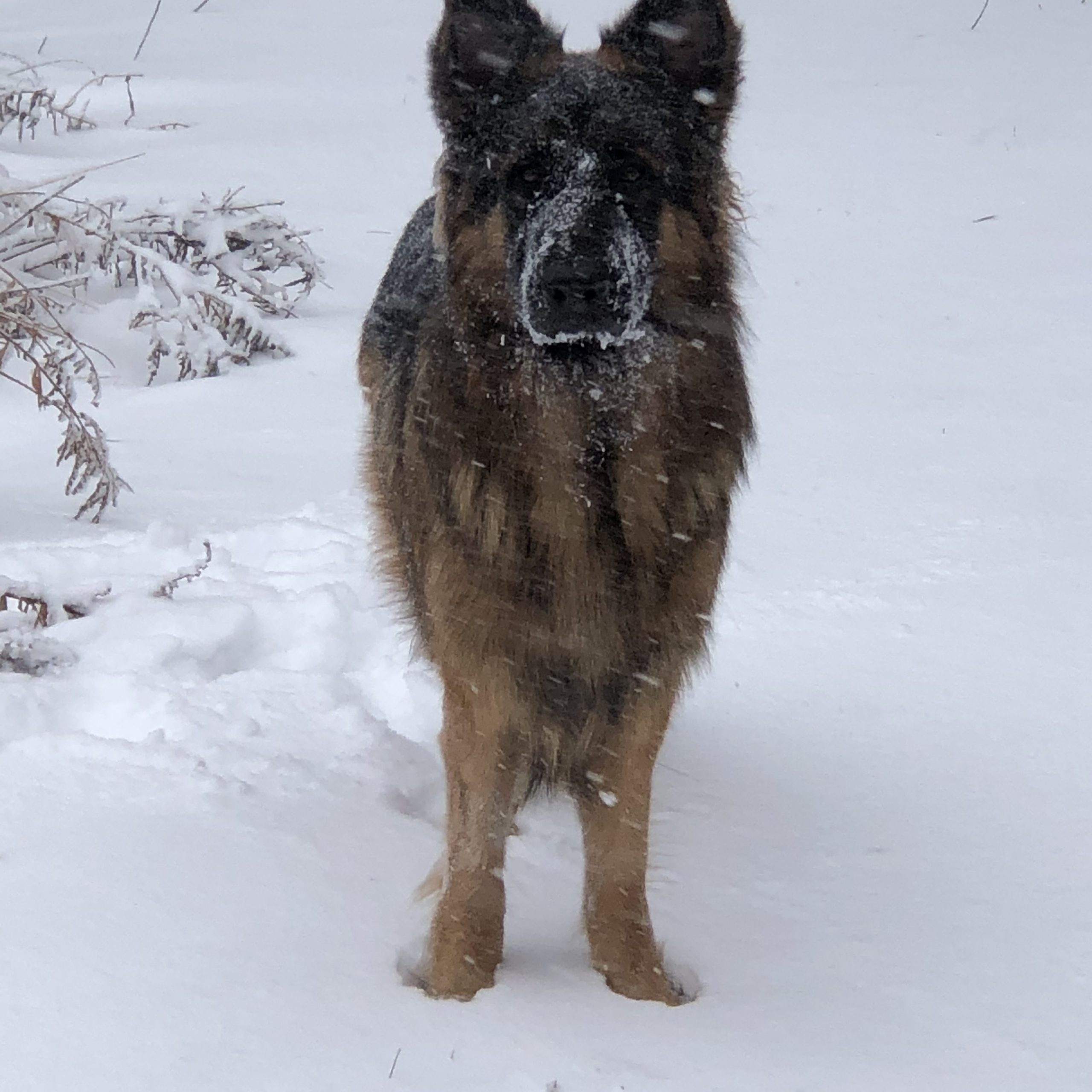 Kevin is a long haired GSD. He is a gentle soul who loves humans and having human friends. He is mild mannered, yet a bit saucy at times, and loves to sit and pose as he is well aware of his good looks! He is an amazing boy who charms all who meet him and always leaves a lasting impression. He has great energy, is fun to spend time with, and is always up for an outing, road trip, hike, swim, bike ride, or camping with a hang by the campfire. He has a great sense of humour and is best described as a ‘Card’. He is devoted to pleasing his humans and is a genuinely great companion. At home Kevin loves to work hard in the bush with his human mom and dad, helping to pull out logs and debris. Kevin is equally happy when given a job or spending time relaxing. He has terrific endurance for a full day of adventure and thrives when given new tasks to learn. Kevin is confident and brave walking into the unknown, and loves a trip to the Vet! His favourite snacks are tuna and salmon, ham, vanilla ice cream, chips & dip, and of course, cheese.