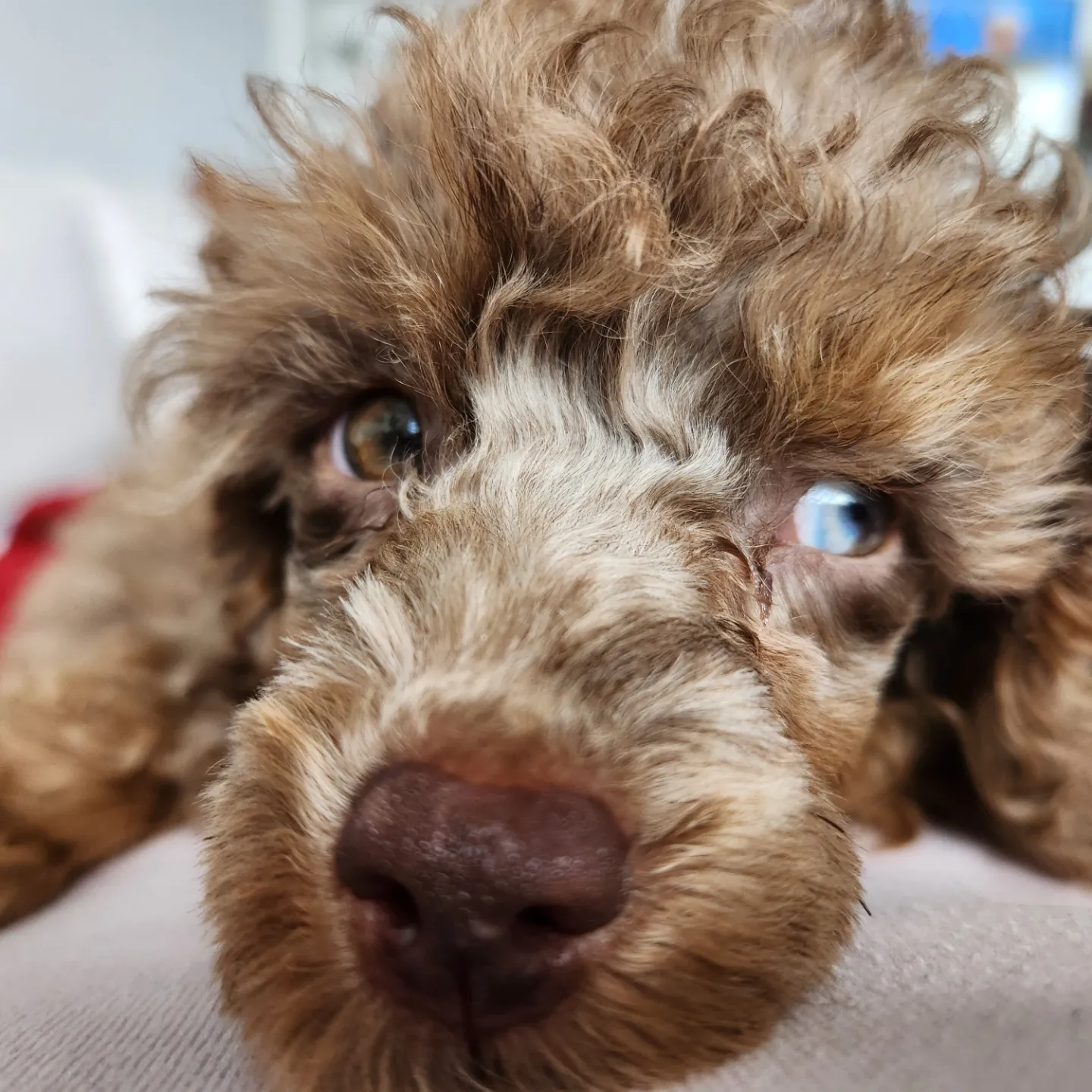 He is a chocolate phantom Merle with a half blue hazel eye and a hazel with a little blue dot.