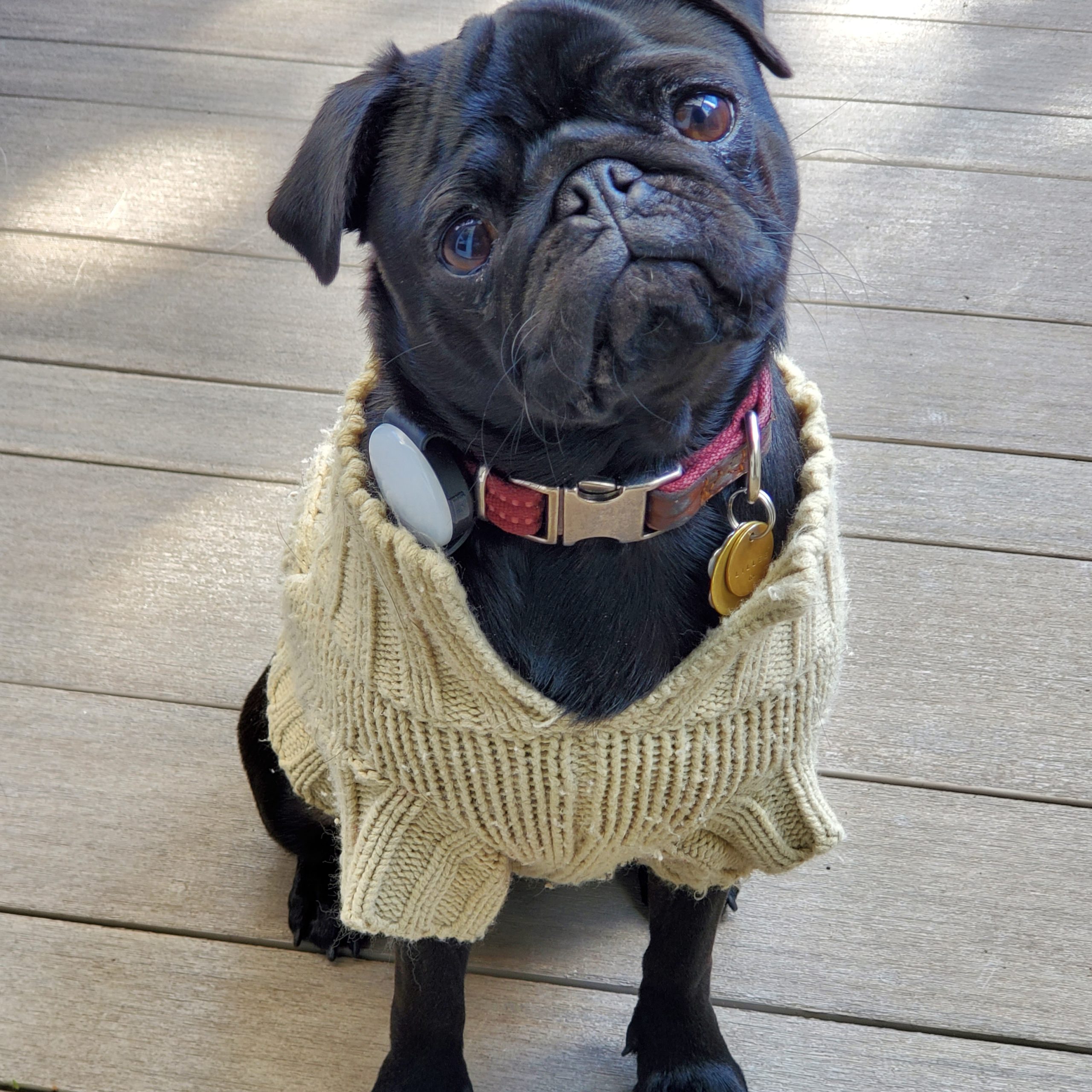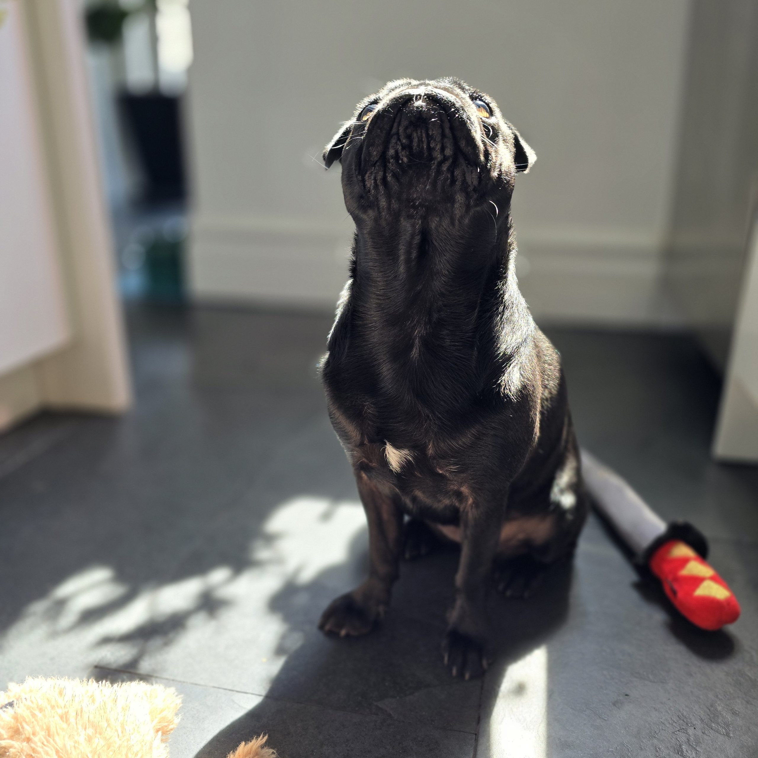Lillee is the sweetest girl who doesn't know she's a Pug. Part marathon runner and Olympic hurdler, and part mini Einstein, she usually outwits us all. This girl loves to move! Lillee is fascinated by any spraying water and can be found running face first into the hose or turning any standing water into a comical splash pad. She is very playful and often looks to find her animal friends behind the tv. Lillee is very good about letting her hoomans dress her up in ridiculous garb so we can all adore her even more than we already do. However, on her own time, Lillee prefers to be an introspective people watcher, with a true curiosity of the world, often stopping on walks to just sit and absorb any new sounds or scents before moving along. When Lillee isn't getting away with her silly puppy antics, her huge innocent eyes and lopsided pout will surely melt your heart.