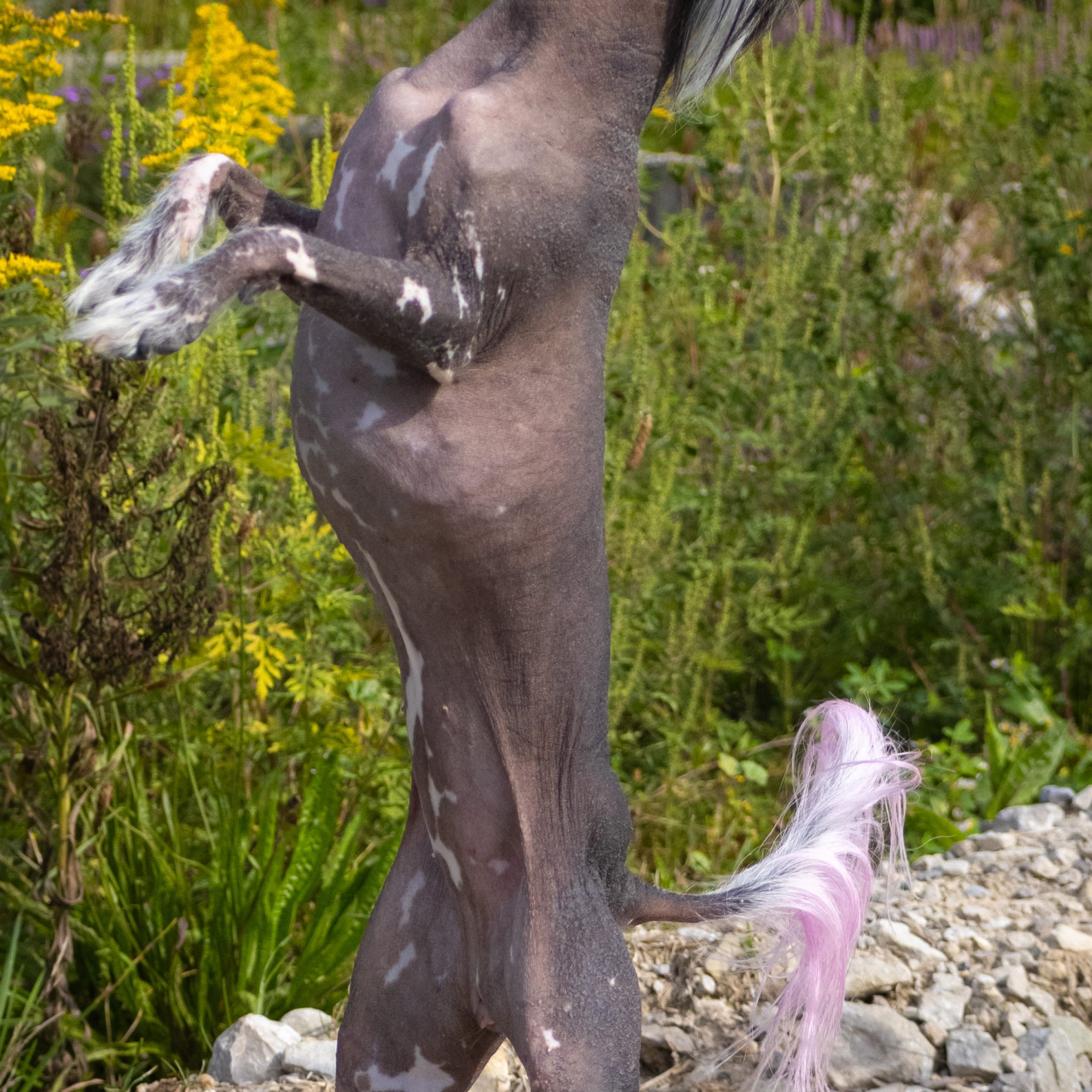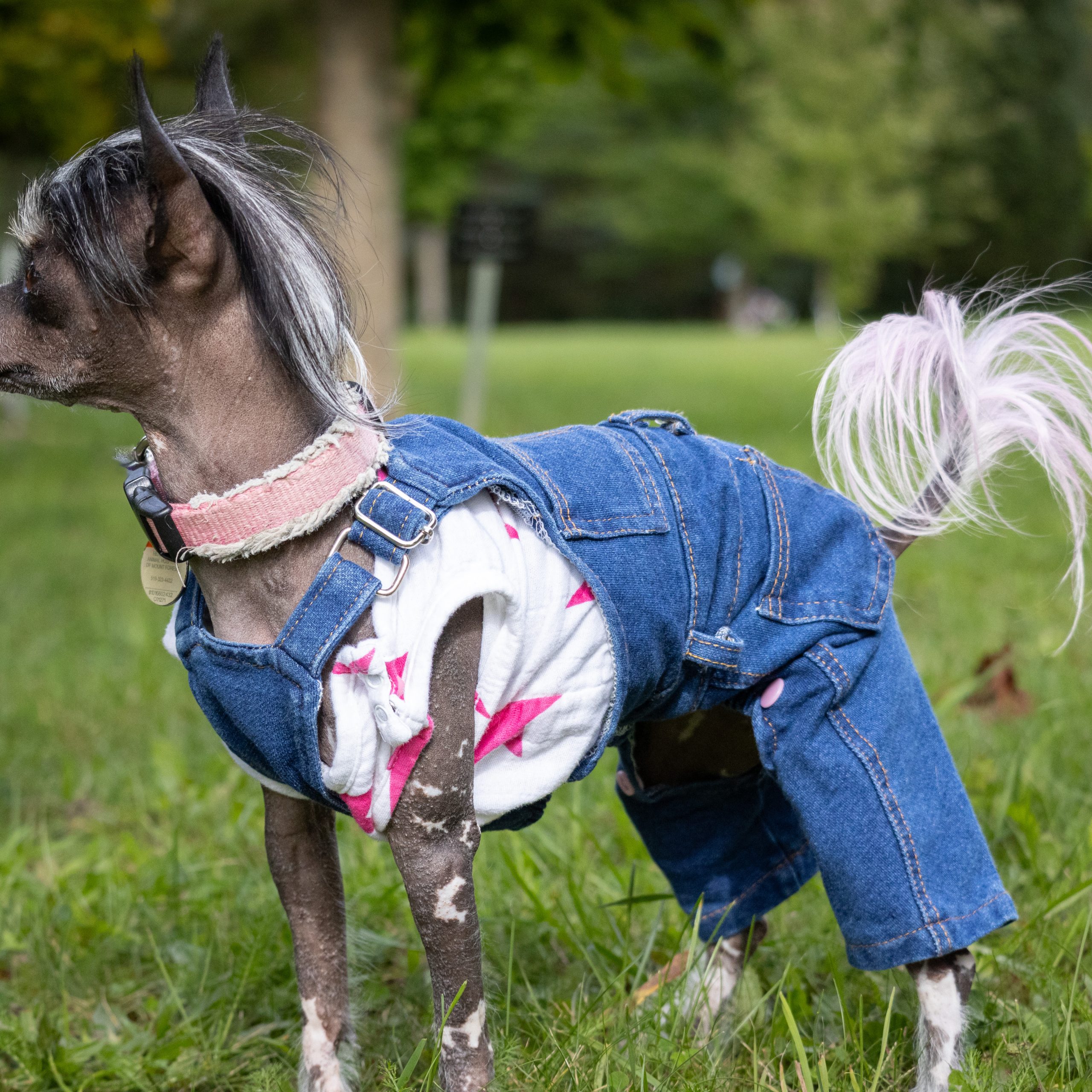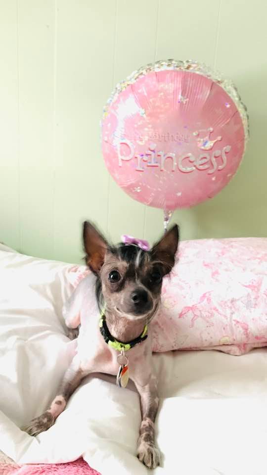 Meet Phoebe-Rose (Phoebe) she is a 3 year old hairless chinese crested female. She weighs about 5 lbs. Her hobbies include racing, chasing the cat, riding around in my shirt, walking. She is very food driven and will do just about anything for her favorite treats (all treats are her favorite). Her favorite toy is Lampchop stuffie. She's a bit of a dock diver but its something we are just beginning so while she does it she doesn't "love" it. She is very social with other animals and she thinks everyone is her best friend. She lives with a cat and an african grey parrot. Her tongue sticks out a bit on the one side of her mouth as true to her breed she has poor dentin so retaining her teeth is a challange. She is used to wearing clothing and I do often wear her as you might a human baby. She is joy and a treasure. She is my covid puppy. In the winter her tan will fade and she will become more pink, I have enclosed a pic of what she looks like in winter, this was taken in March so way into winter. It takes no time for her to tan up again.