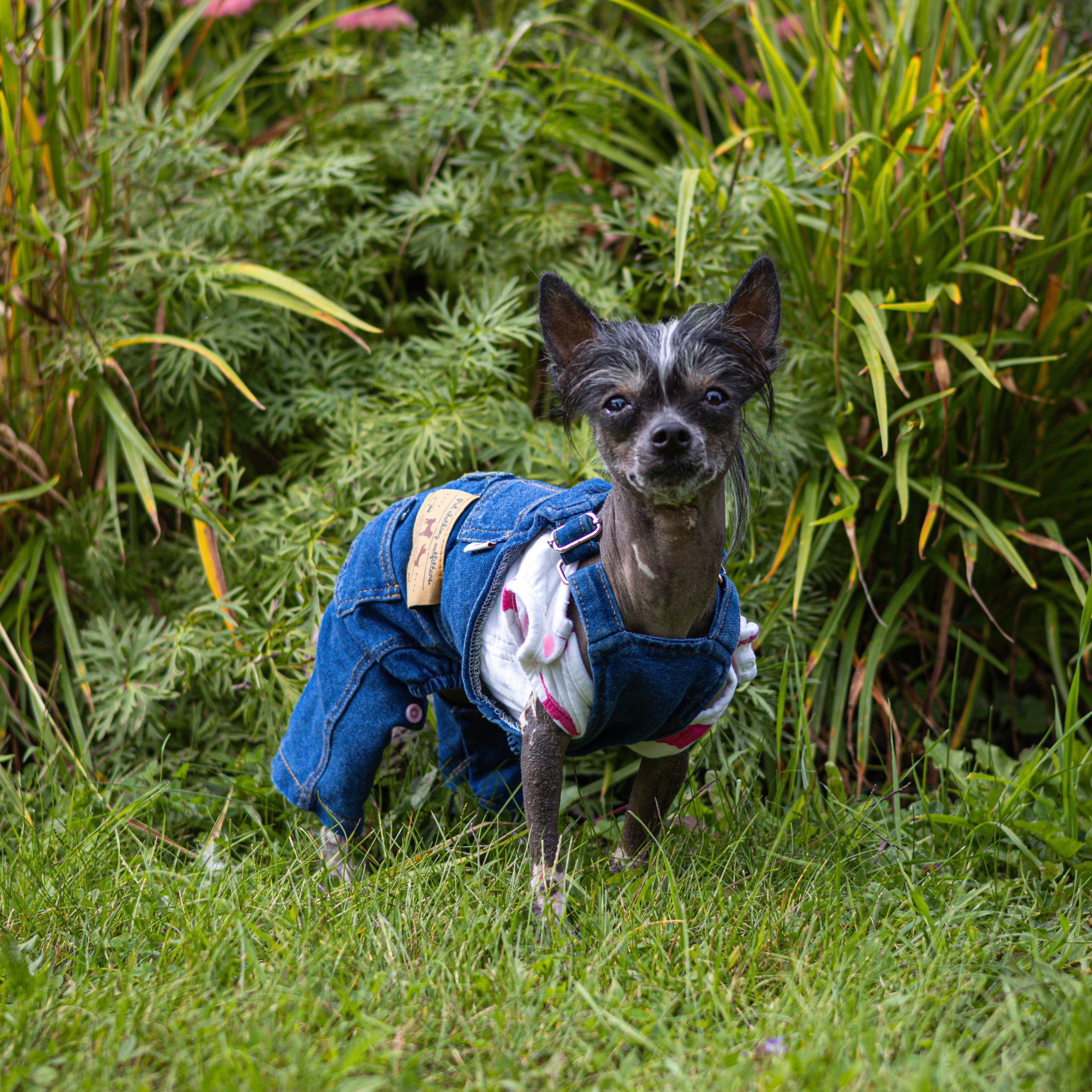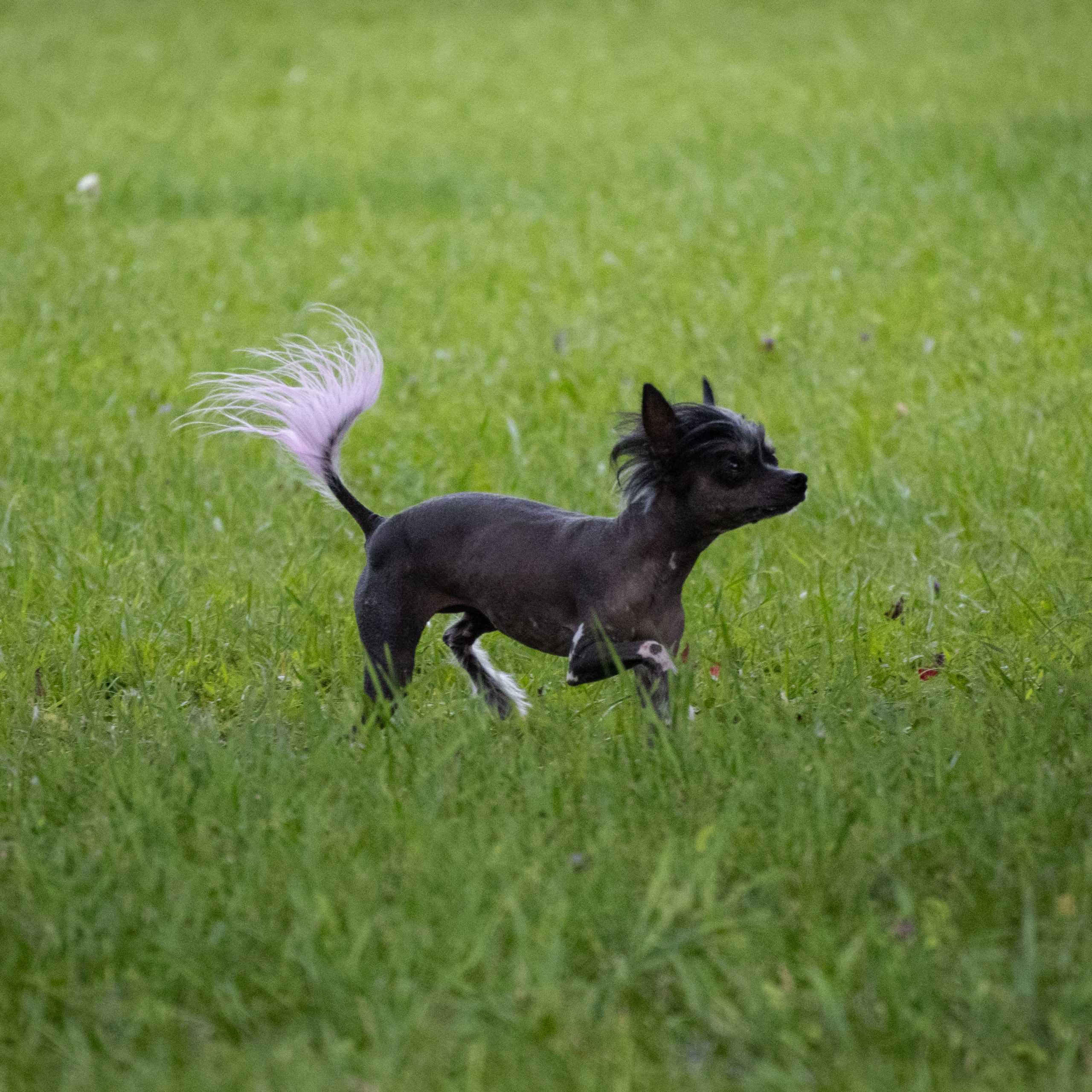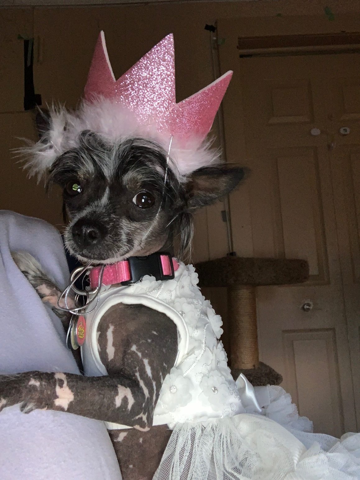 Meet Phoebe-Rose (Phoebe) she is a 3 year old hairless chinese crested female. She weighs about 5 lbs. Her hobbies include racing, chasing the cat, riding around in my shirt, walking. She is very food driven and will do just about anything for her favorite treats (all treats are her favorite). Her favorite toy is Lampchop stuffie. She's a bit of a dock diver but its something we are just beginning so while she does it she doesn't "love" it. She is very social with other animals and she thinks everyone is her best friend. She lives with a cat and an african grey parrot. Her tongue sticks out a bit on the one side of her mouth as true to her breed she has poor dentin so retaining her teeth is a challange. She is used to wearing clothing and I do often wear her as you might a human baby. She is joy and a treasure. She is my covid puppy. In the winter her tan will fade and she will become more pink, I have enclosed a pic of what she looks like in winter, this was taken in March so way into winter. It takes no time for her to tan up again.