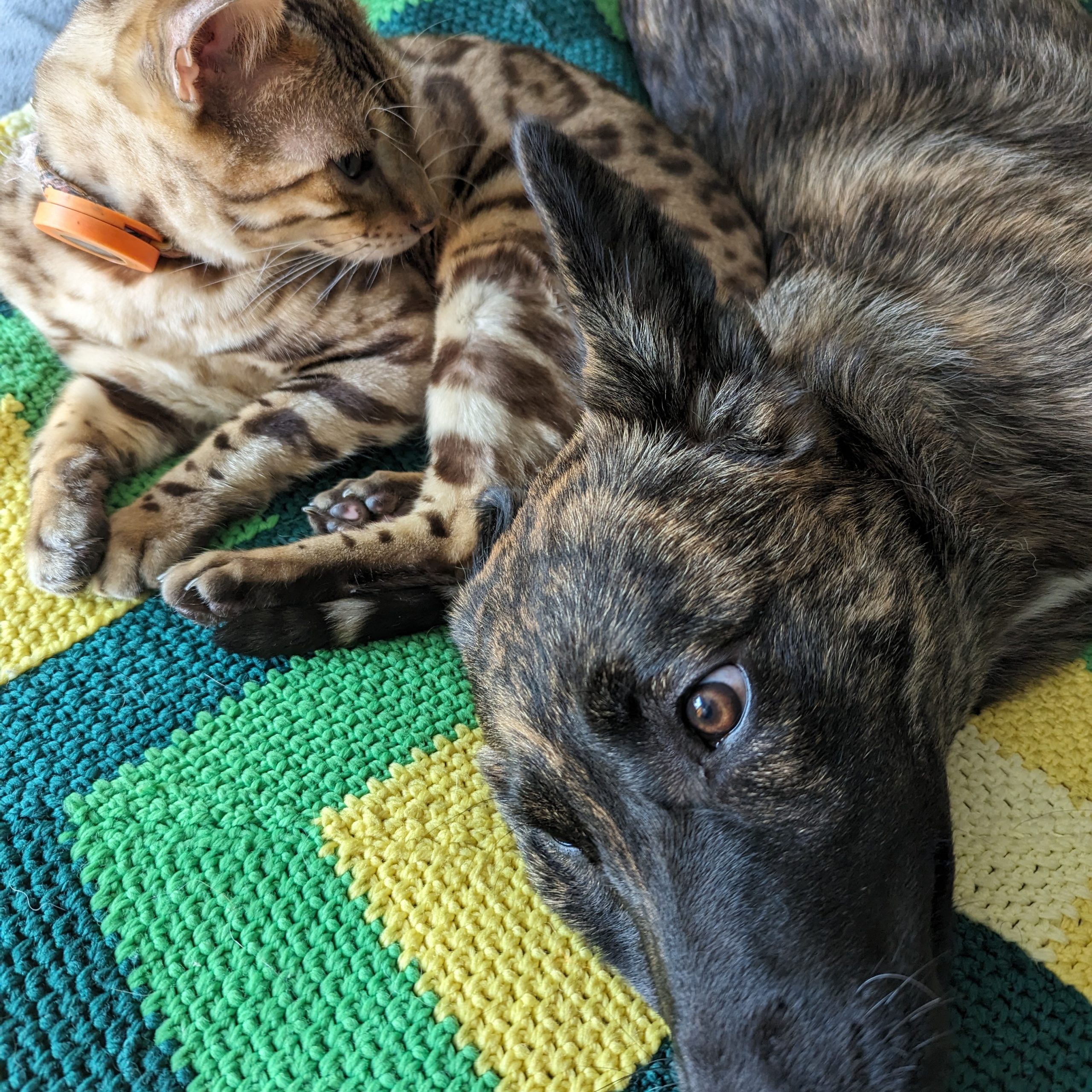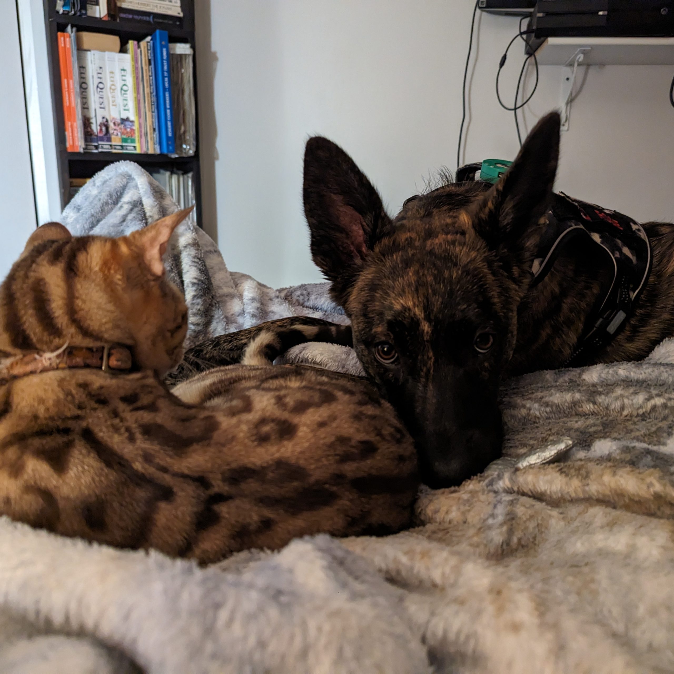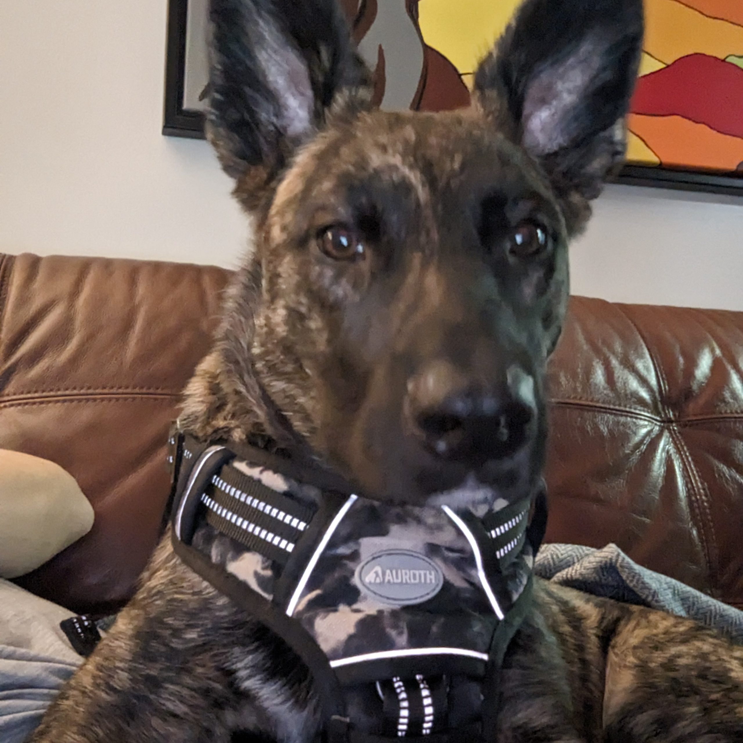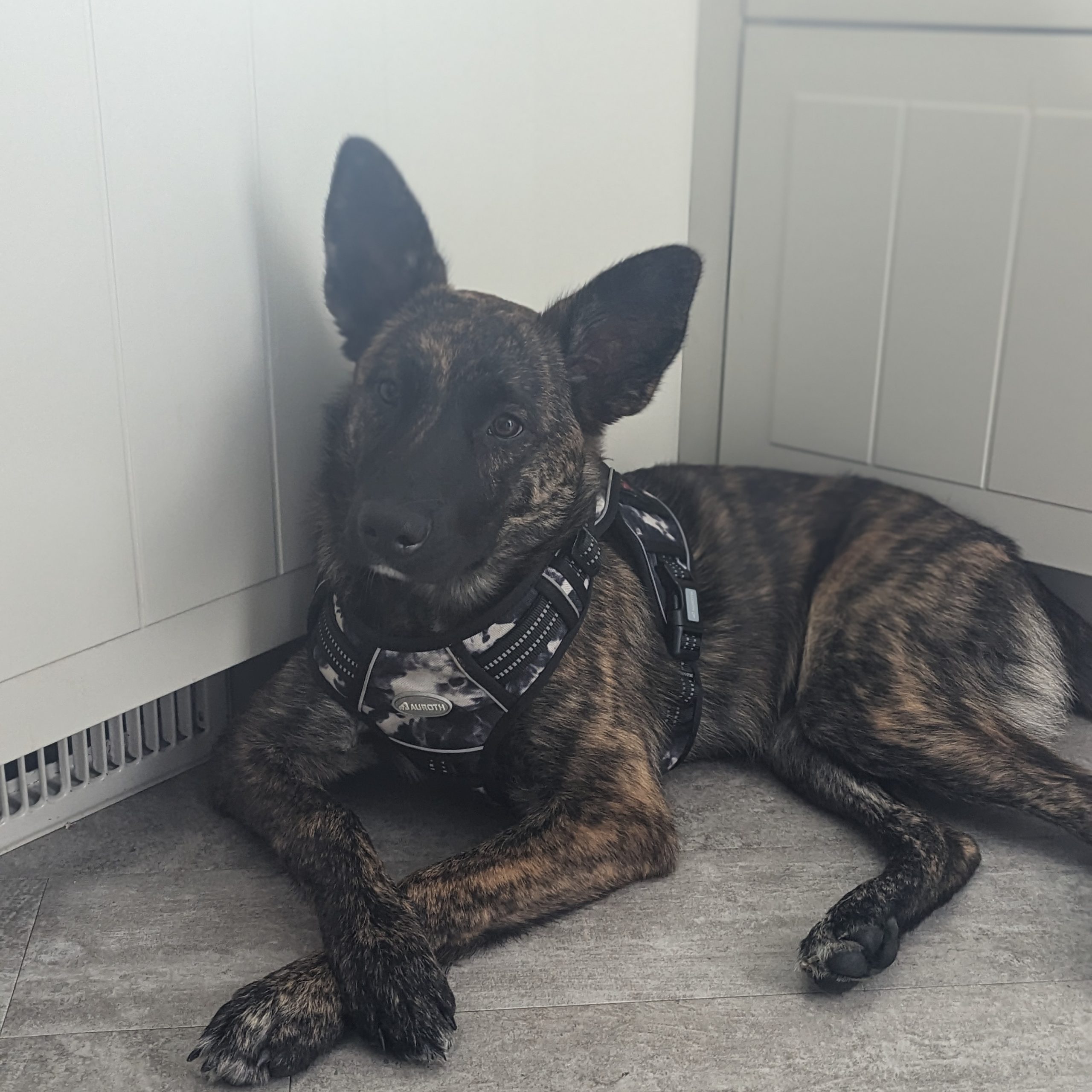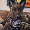 Rosie is a Malinois mix but looks mostly Malinois. She is currently 8 months old and still learning. She is good with other dogs and cats.