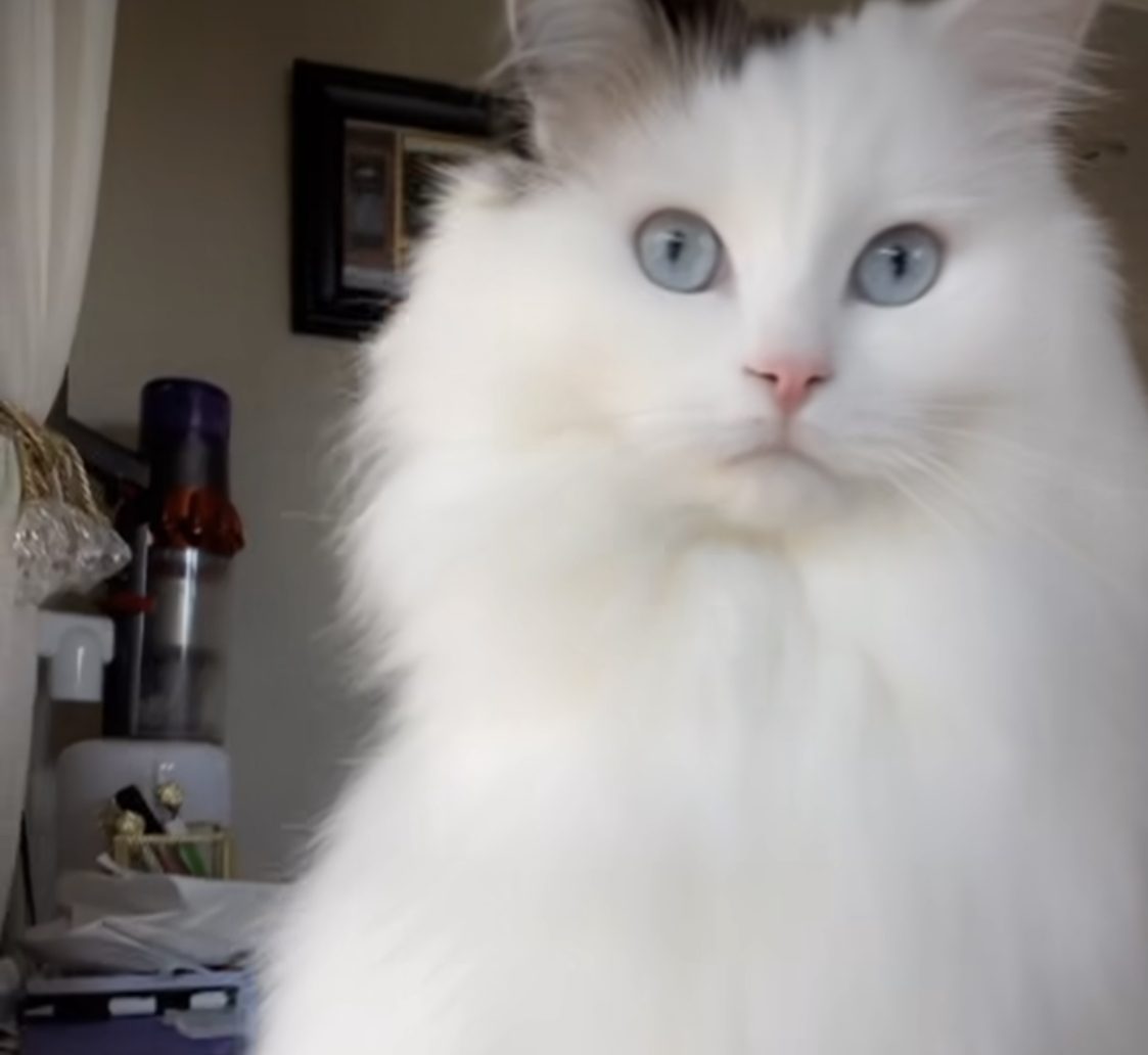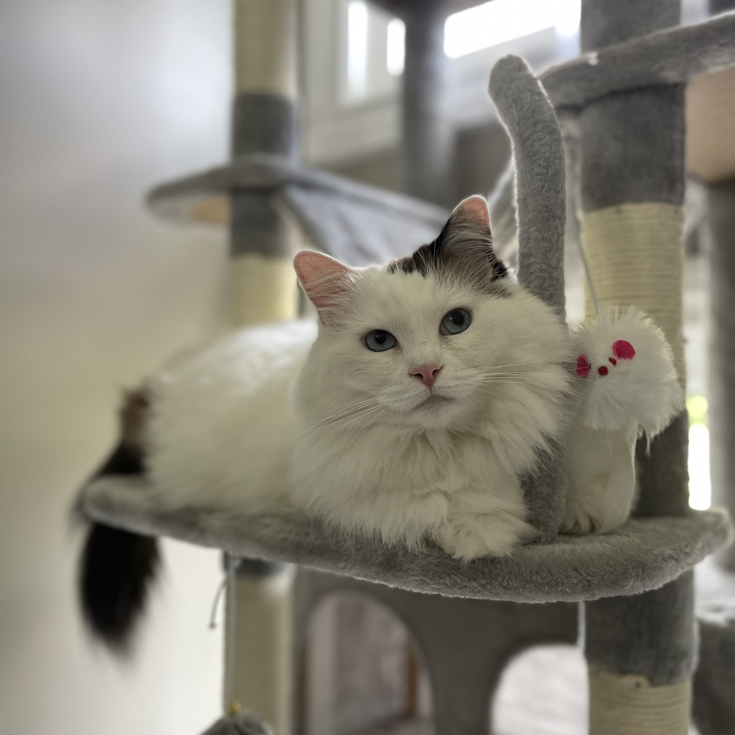 Roxanne is the absolute sweetest cat I have ever come across. She loves to be around people, outside on her leash, and loves my goats and alapcas. She has zero fear. She will walk outside with me all day if I let her, with her tail pointed up happy as can be. I have families that visit our farm daily to meet the Alpacas and goats, and so many come to play with Roxy. She is very chatty. She loves to yell at me when she wants something, and she loves to play tag with my sons. What started out as just a white kitty, has turned into a cat that can calm the most anxious and angry teen in the house..