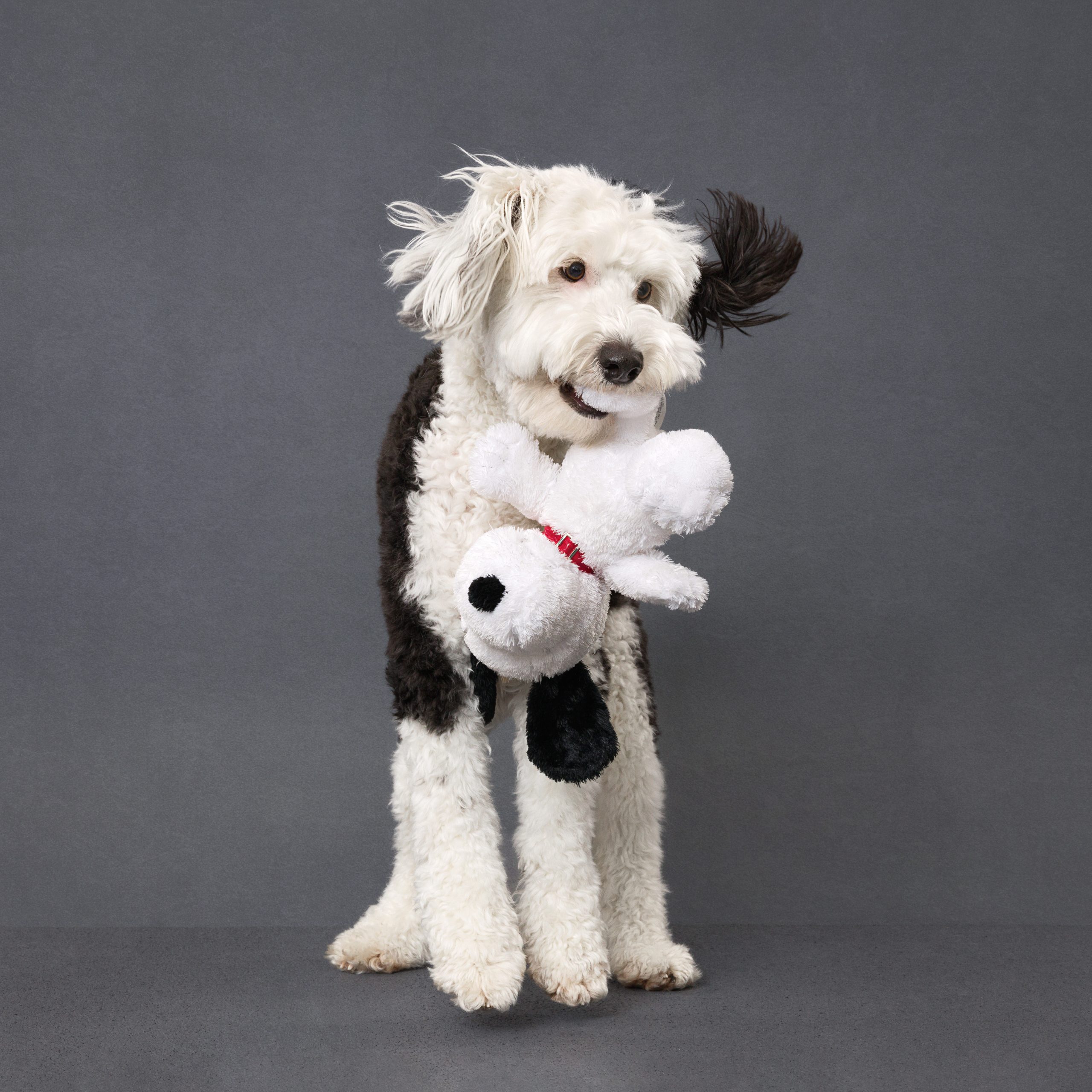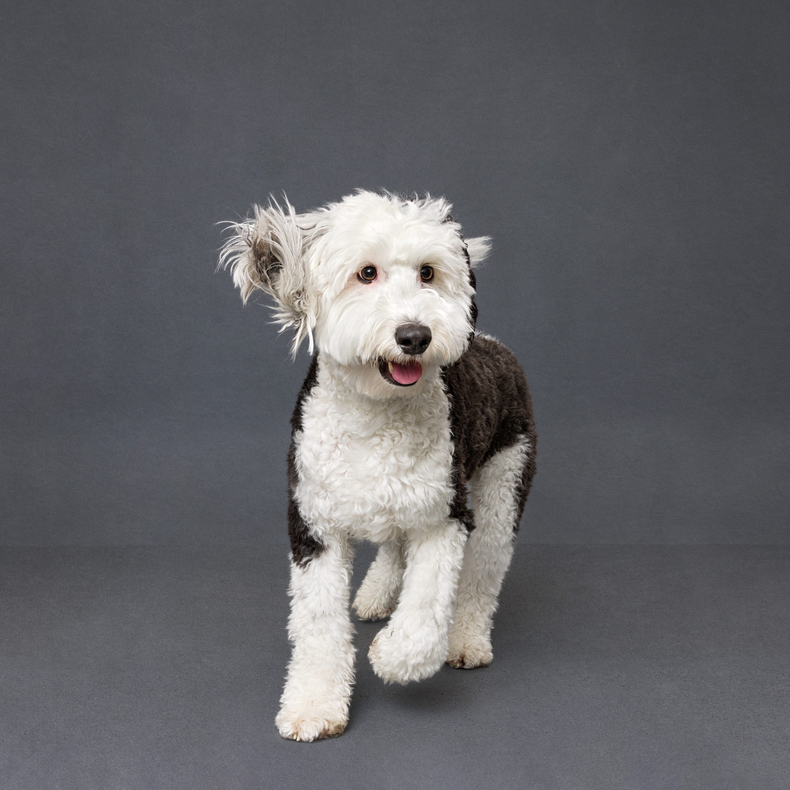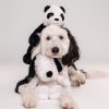 Toby is a very well trained Mini Sheepadoodle. He loves to work the camera and knows a lot of tricks. He's often been compared to Snoopy & Mr Muggs. He appeals to a lot of different audiences and is very marketable. He does well in all environments. Has a very sweet demeanor and signature look with his one black ear.