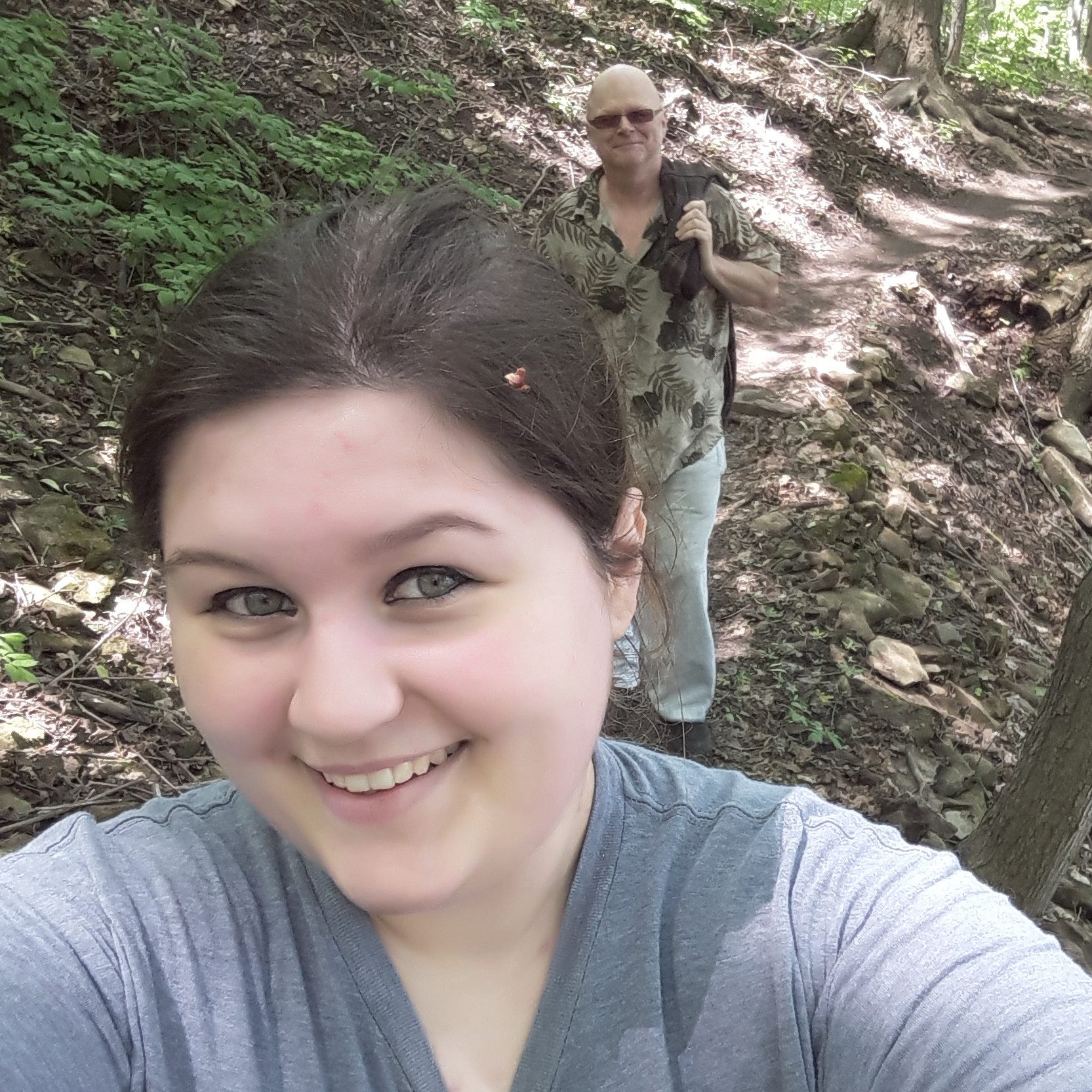 Large sized friendly women with two huskies Green eyes, brown hair and pale skin .